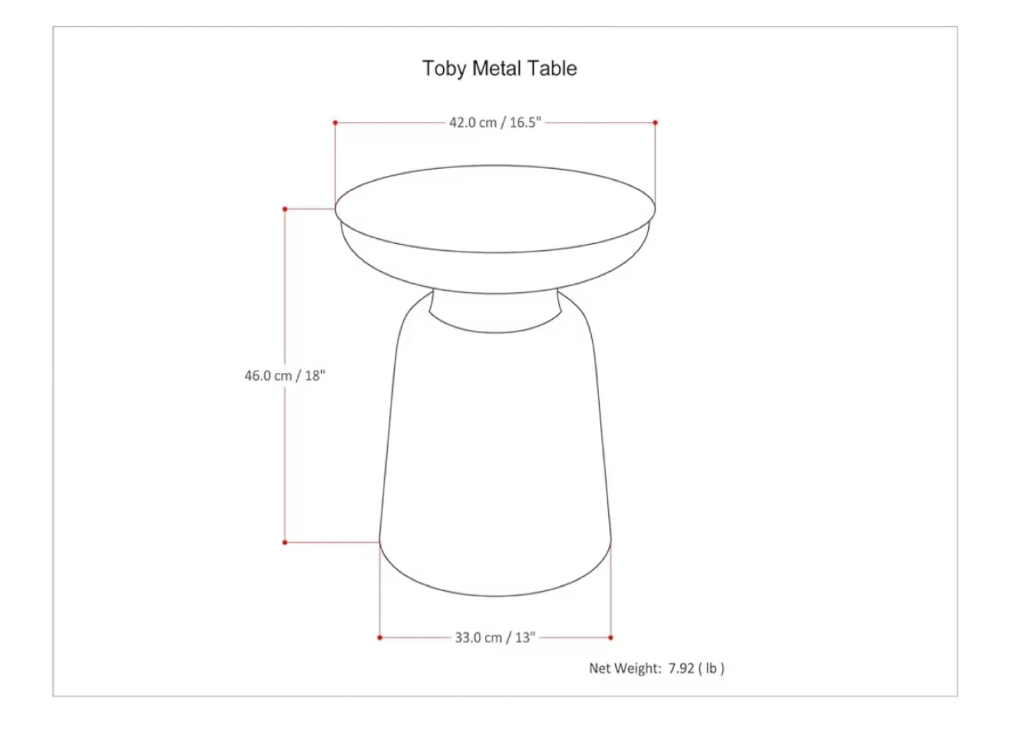 This SIMPLIHOME Toby Metal Table is 18 inches tall with a 16.5-inch wide top. It's crafted from solid iron for durability. It's assembled and ready for use!