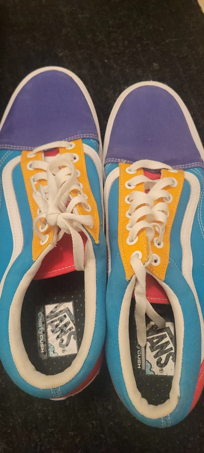 Vans Old Skool sneakers in a vibrant colour block design. Features the classic side stripe and ComfyCush insoles. Textile and canvas upper with rubber sole. These shoes are perfect for adding a pop of colour to any casual outfit!