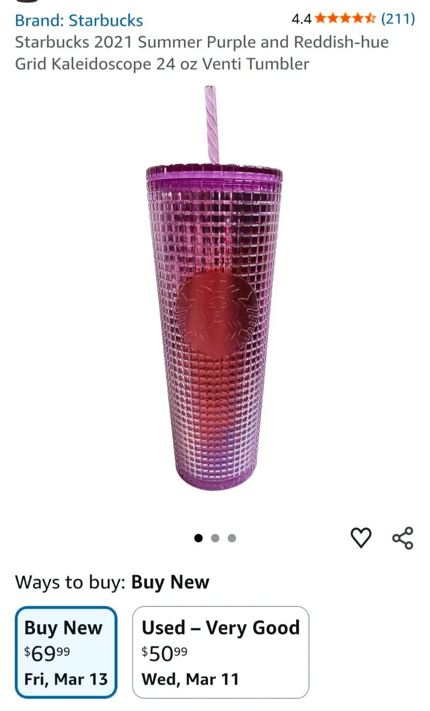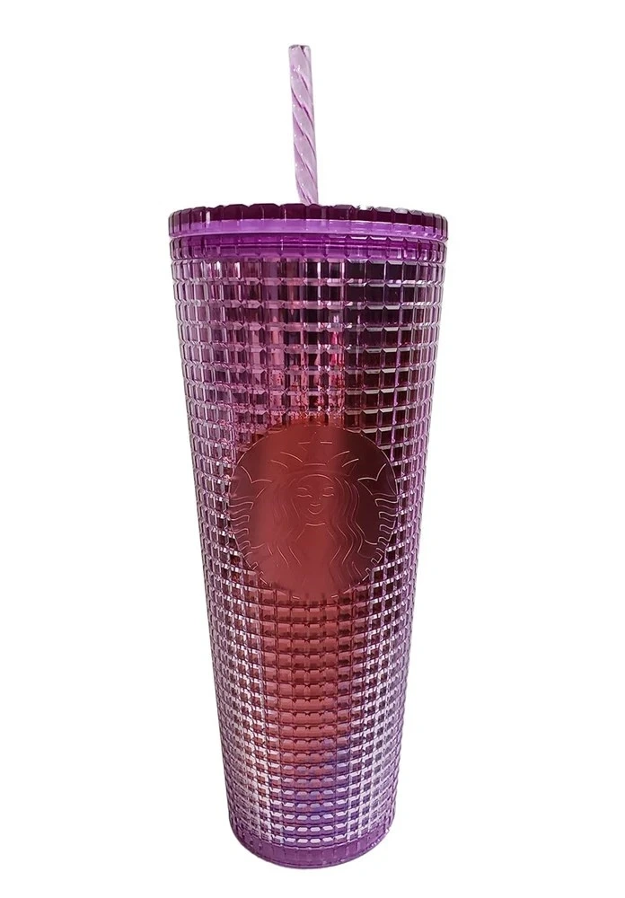 This reusable Starbucks tumbler is a fun way to enjoy your favourite drinks. It's made of durable plastic with a textured grid design. Includes a matching straw. Perfect for cold beverages on the go!