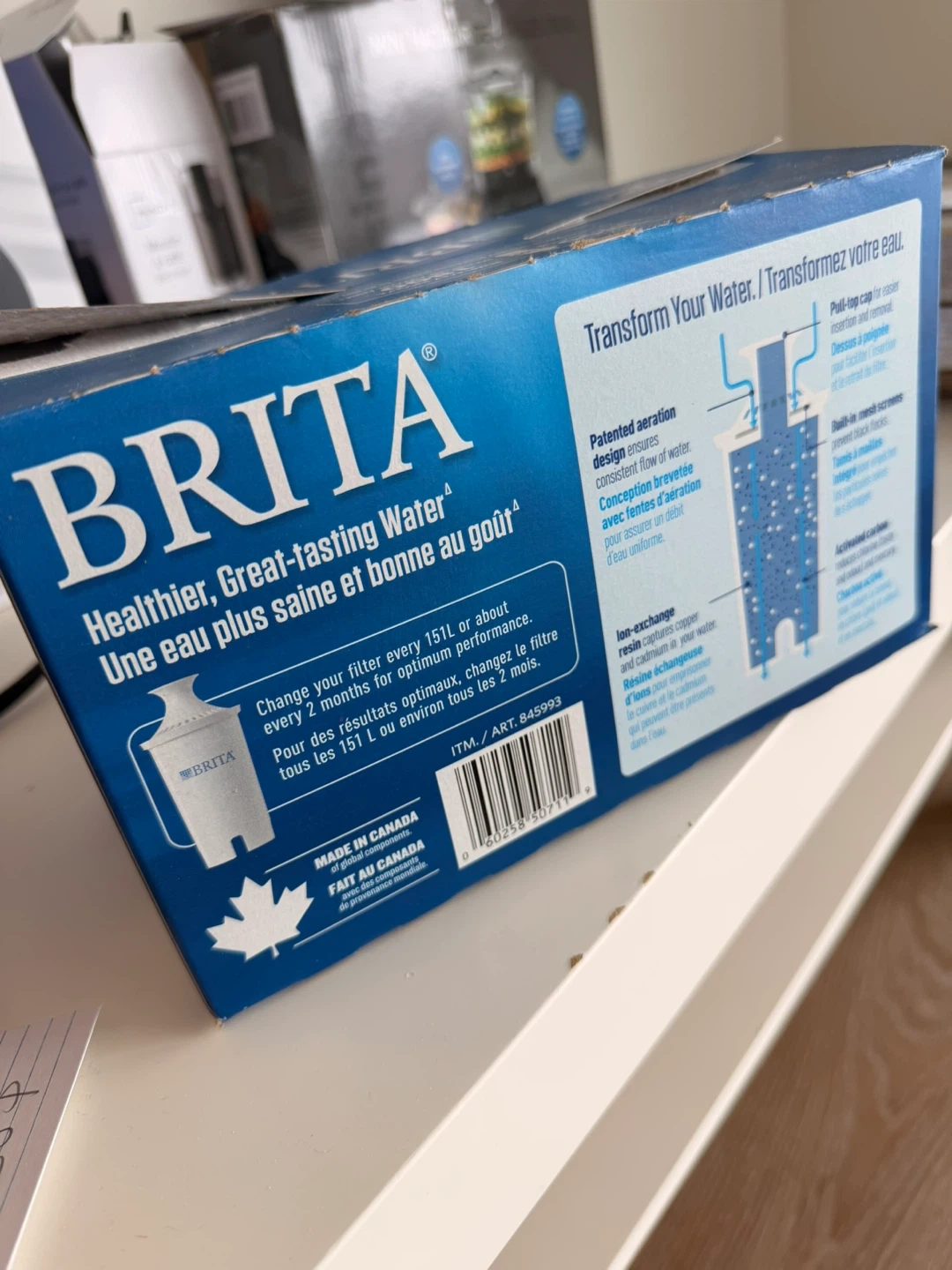 BRITA water filter for healthier, great-tasting water. Change filter every 151L or about 2 months for optimum performance. Made in Canada with global components. Ion-exchange resin captures copper and cadmium.
