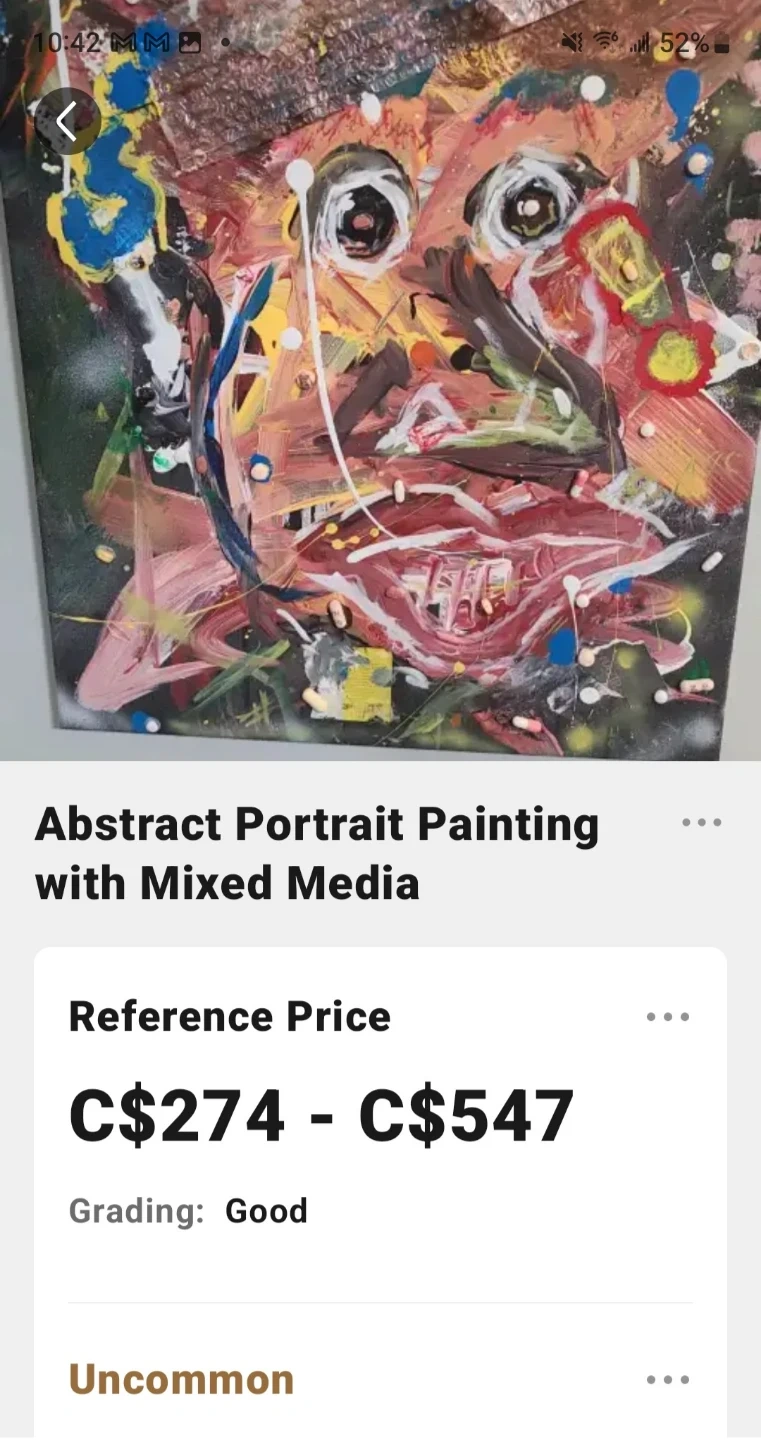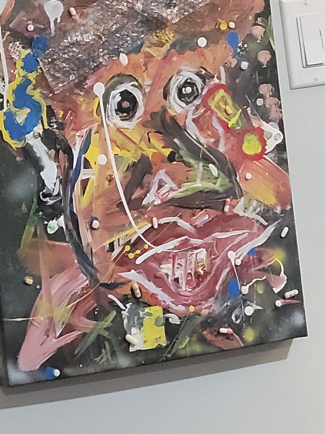 This abstract portrait painting uses mixed media with a bold colour palette and dynamic brushstrokes. Found objects like bubble wrap and pills are incorporated into the artwork. It's an expressive piece that offers a unique texture and unconventional materials.