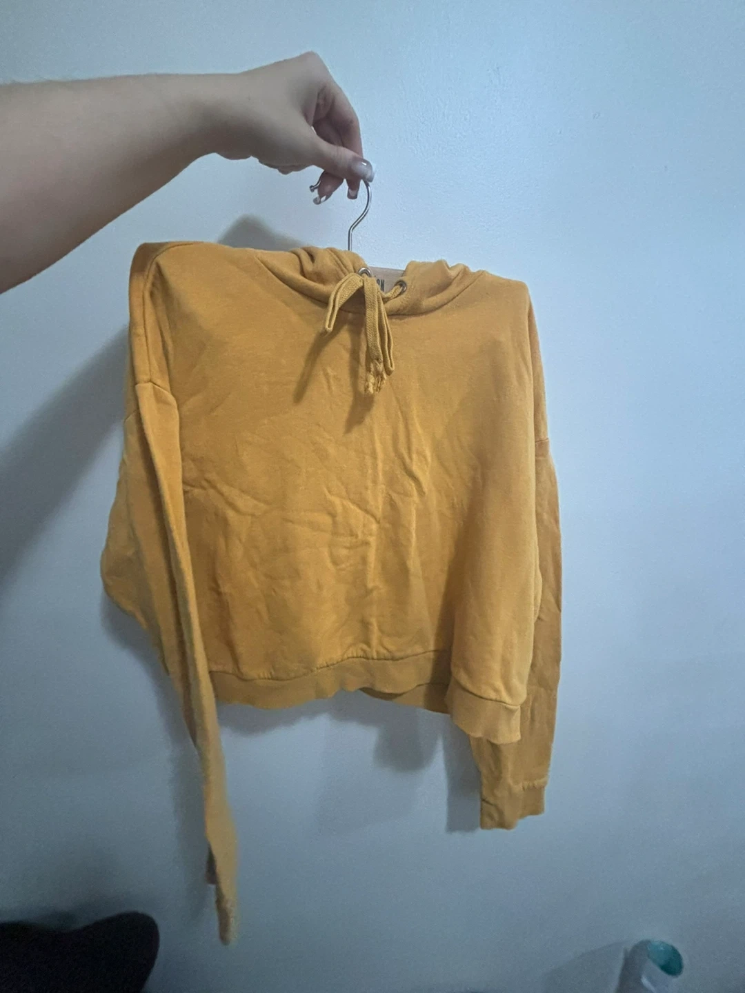 This is a mustard yellow cropped hoodie. It's made of a soft cotton blend and has a drawstring hood. The fit is relaxed and cropped.