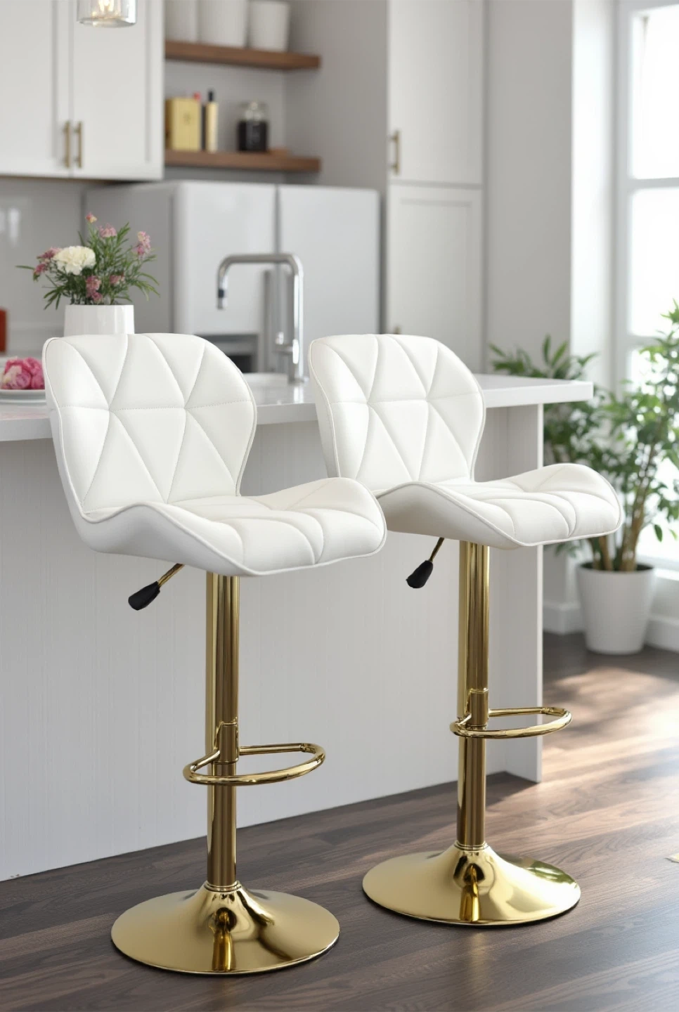 Stylish look and comfortable seating. Adjustable (21” – 33”). Swivel seats. Back support and footrest. Rubber ring to prevent floor scratching included.