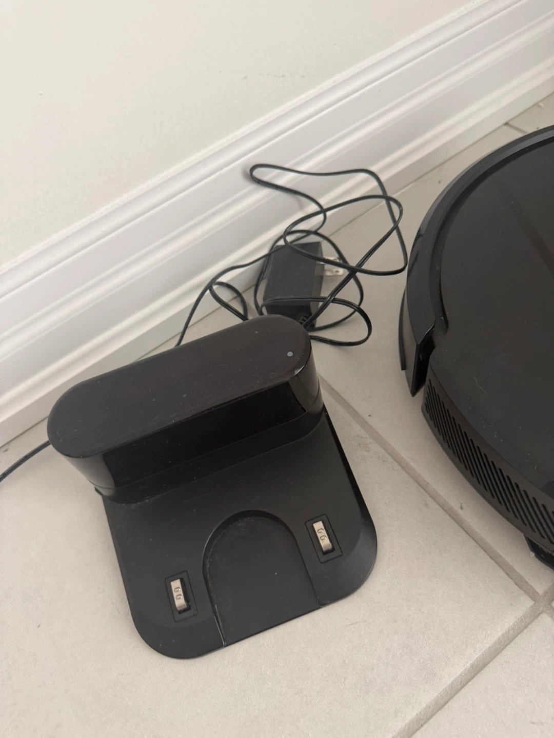 This is a black Laresar robot vacuum cleaner. It comes with its charging dock and power adapter. It's designed to automatically clean floors.