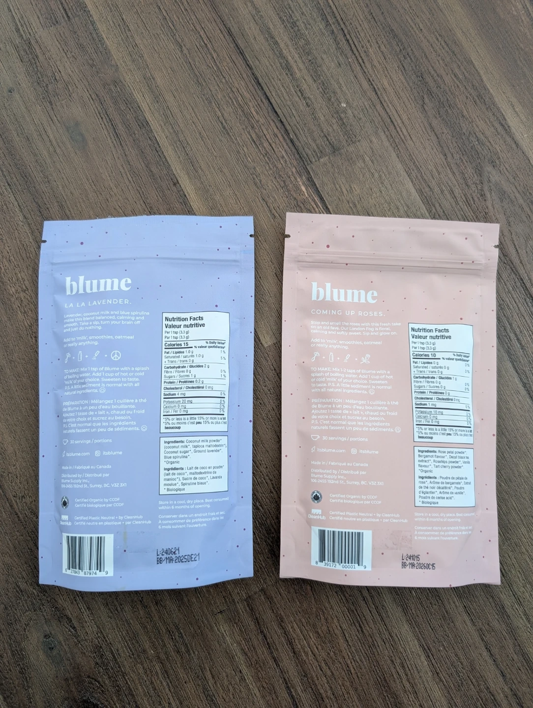 Brand new sealed Blume Superfood Latte Mix: Blue Lavender and Rose London Fog. Each bag contains 100g and is plant-based.