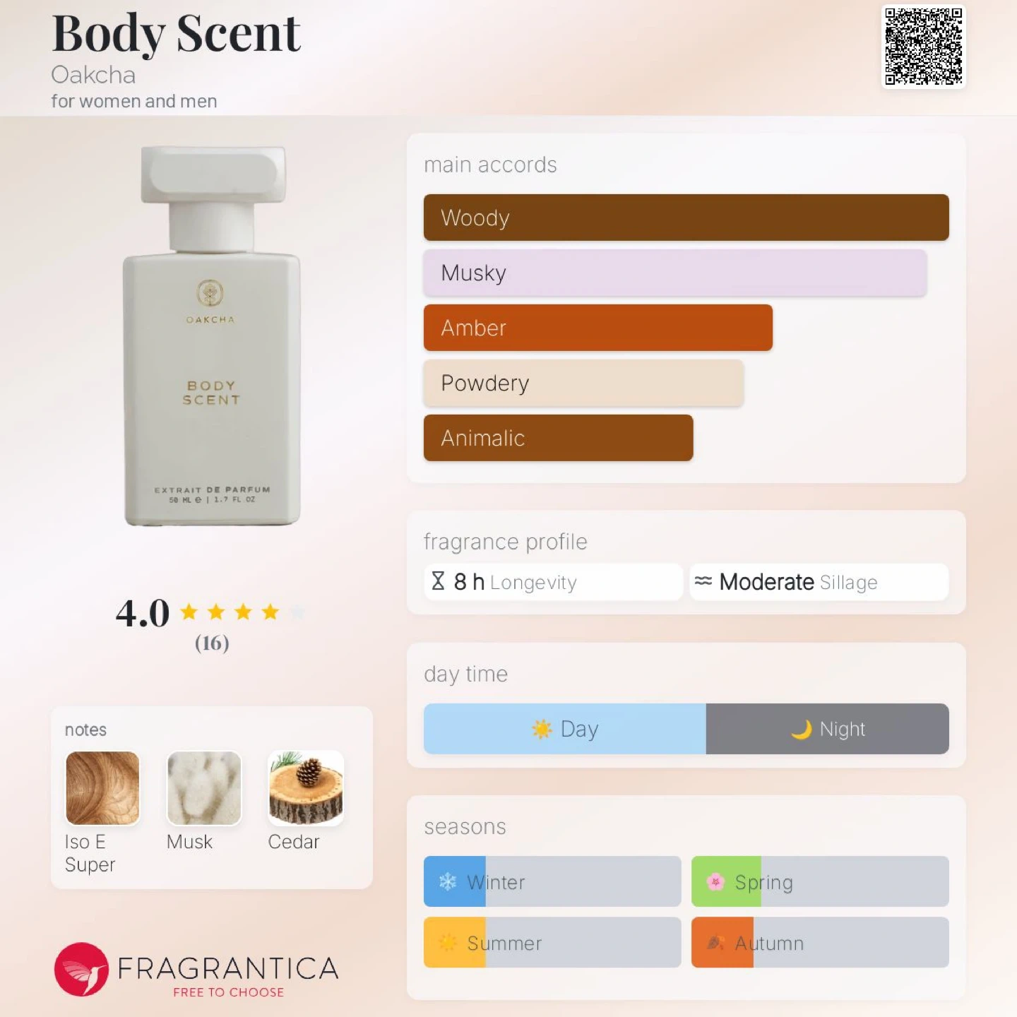 Oakcha Body Scent is an Extrait de Parfum designed for women and men. It has woody, musky, amber, powdery, and animalic accords. This fragrance offers moderate sillage and longevity, making it suitable for day or night wear across all seasons.