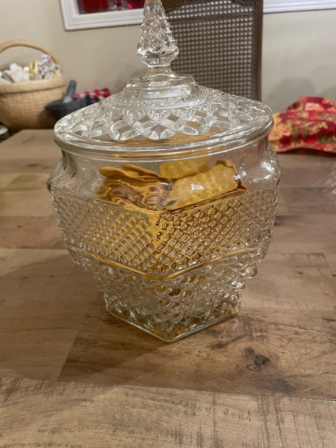This is a vintage Anchor Hocking Wexford pattern clear pressed glass cookie jar with a lid. Perfect condition. Heavy hexagon cris cross design. Rare find.