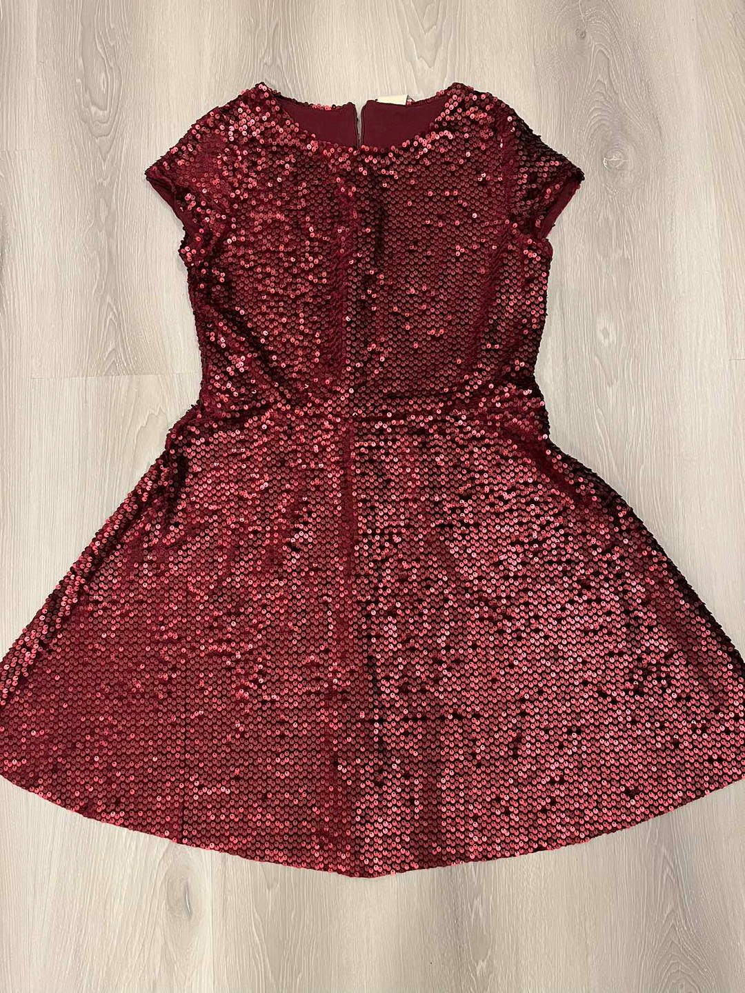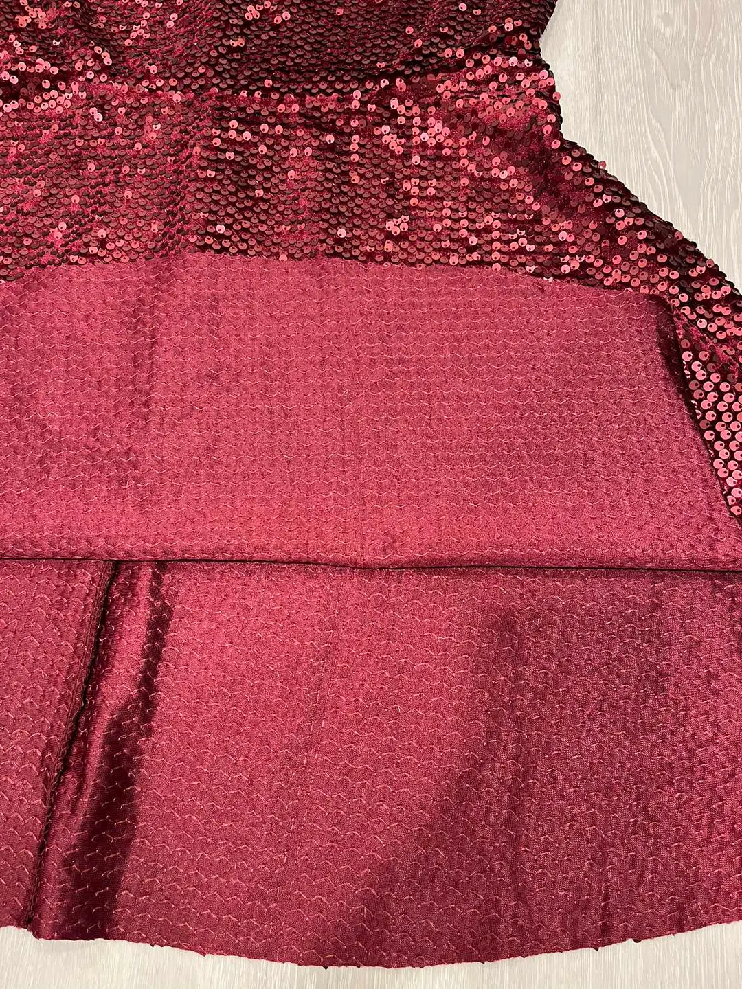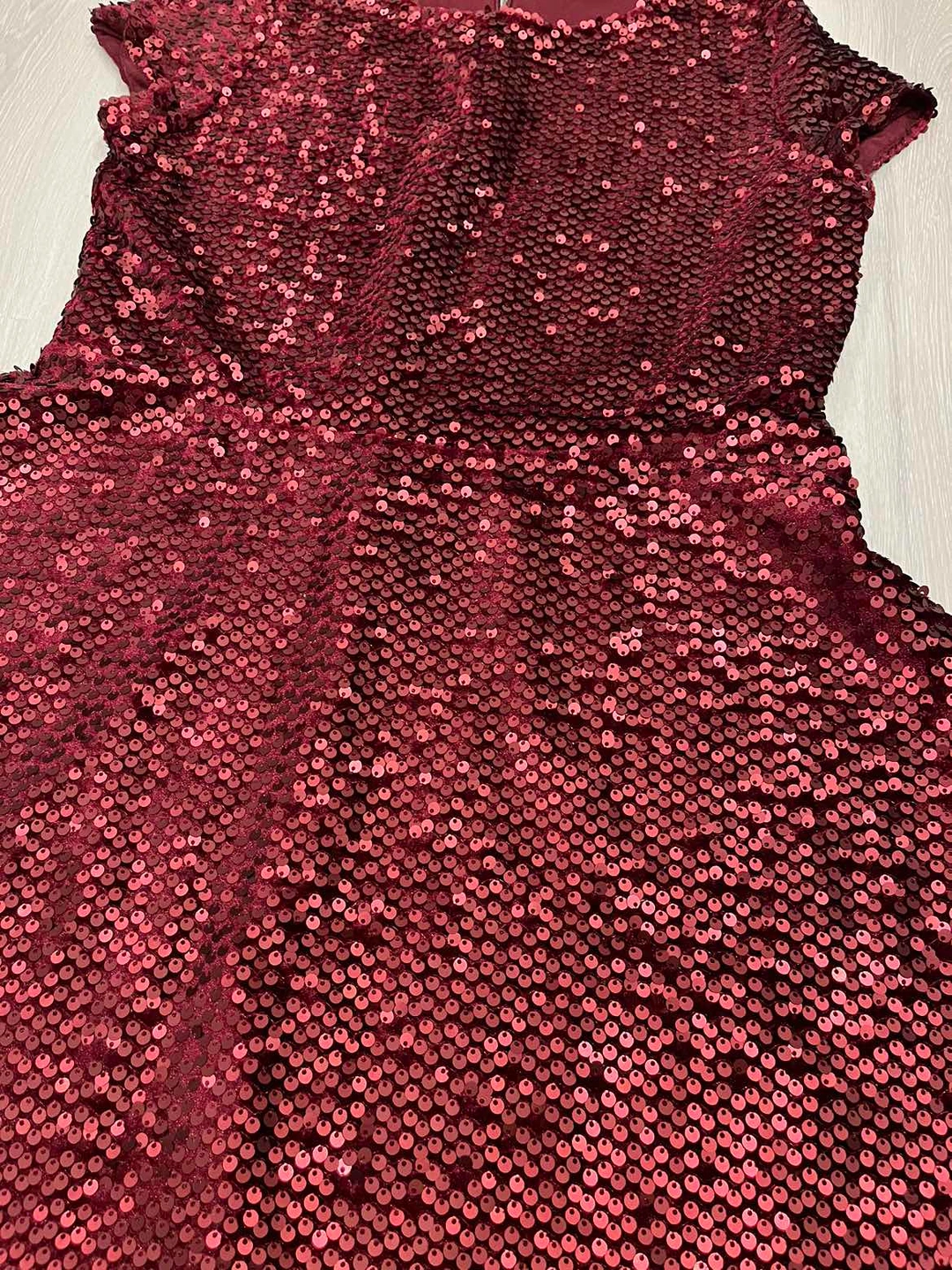 Has layer underneath so won’t itch. Classy wine colour in sequins. In my opinion a little small for 13/14 but should fit a 11/12 year old perfect.