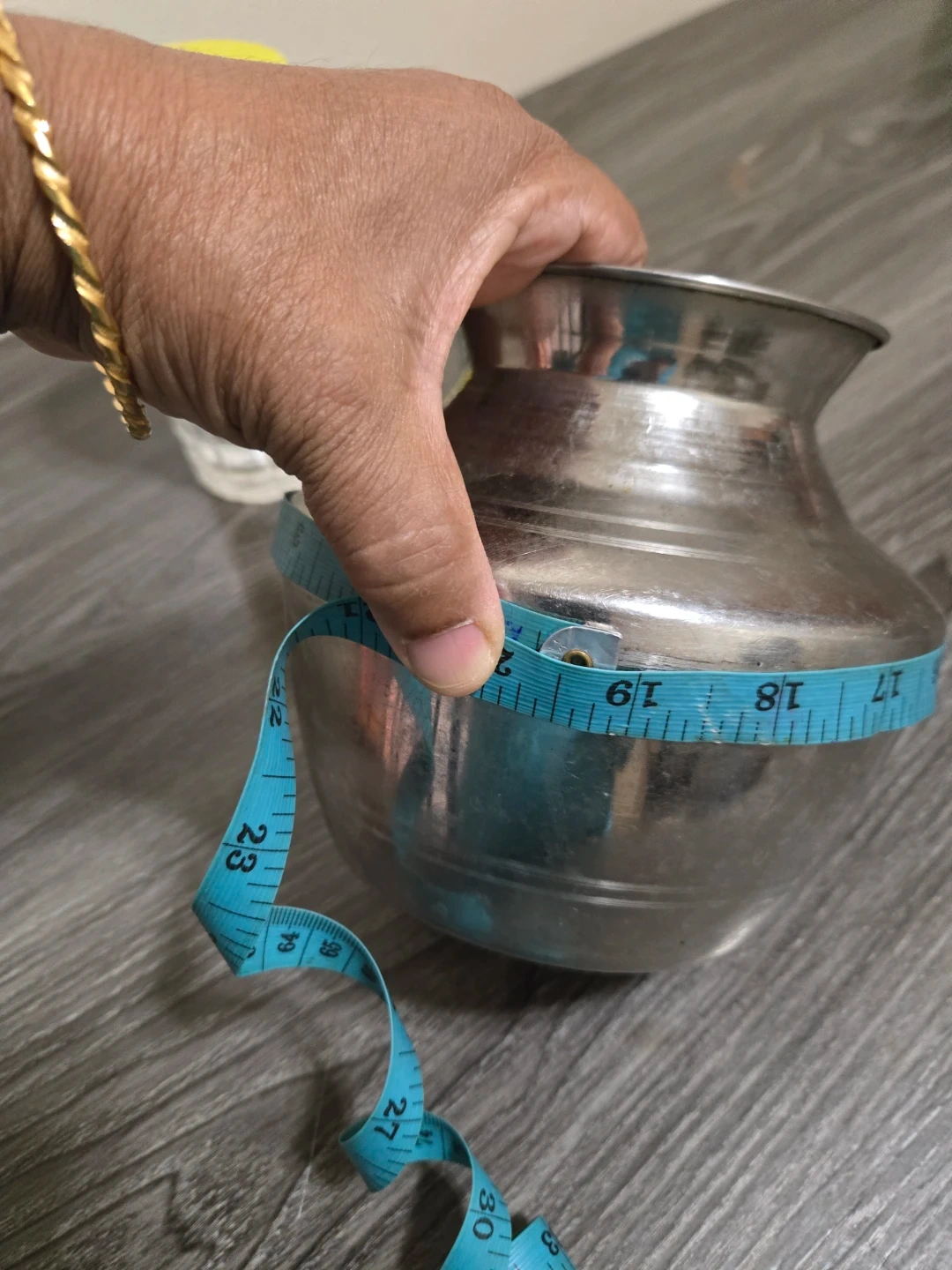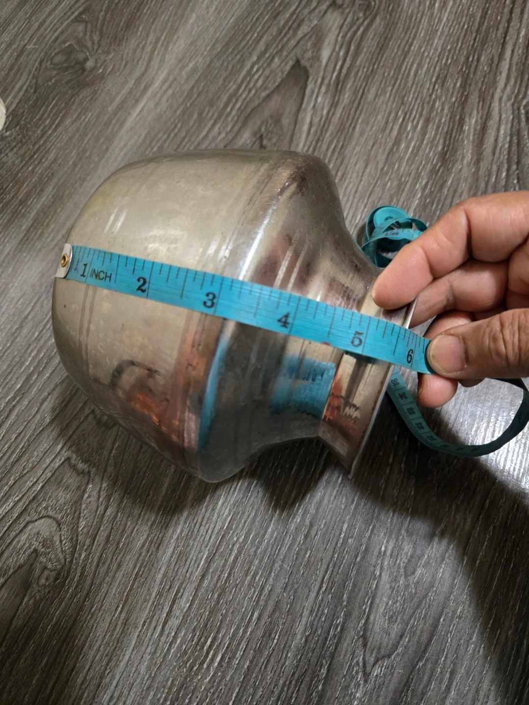 A silver metal pot, suitable for decorative or functional use. Its circumference is approximately 18 inches. Material is metal.