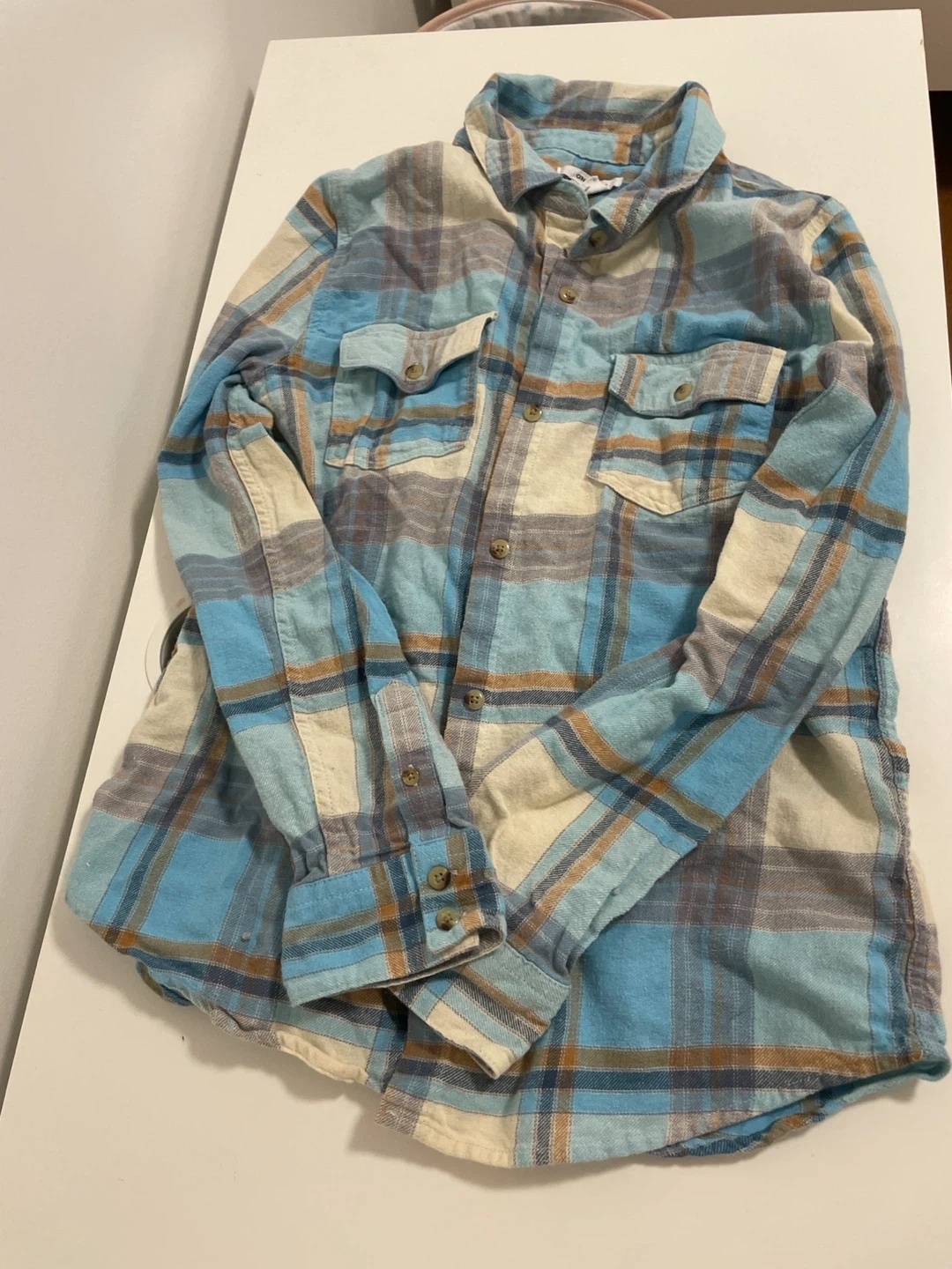 Cozy blue, beige, and brown plaid flannel shirt. It has two chest pockets and button closures. Perfect for cooler weather!