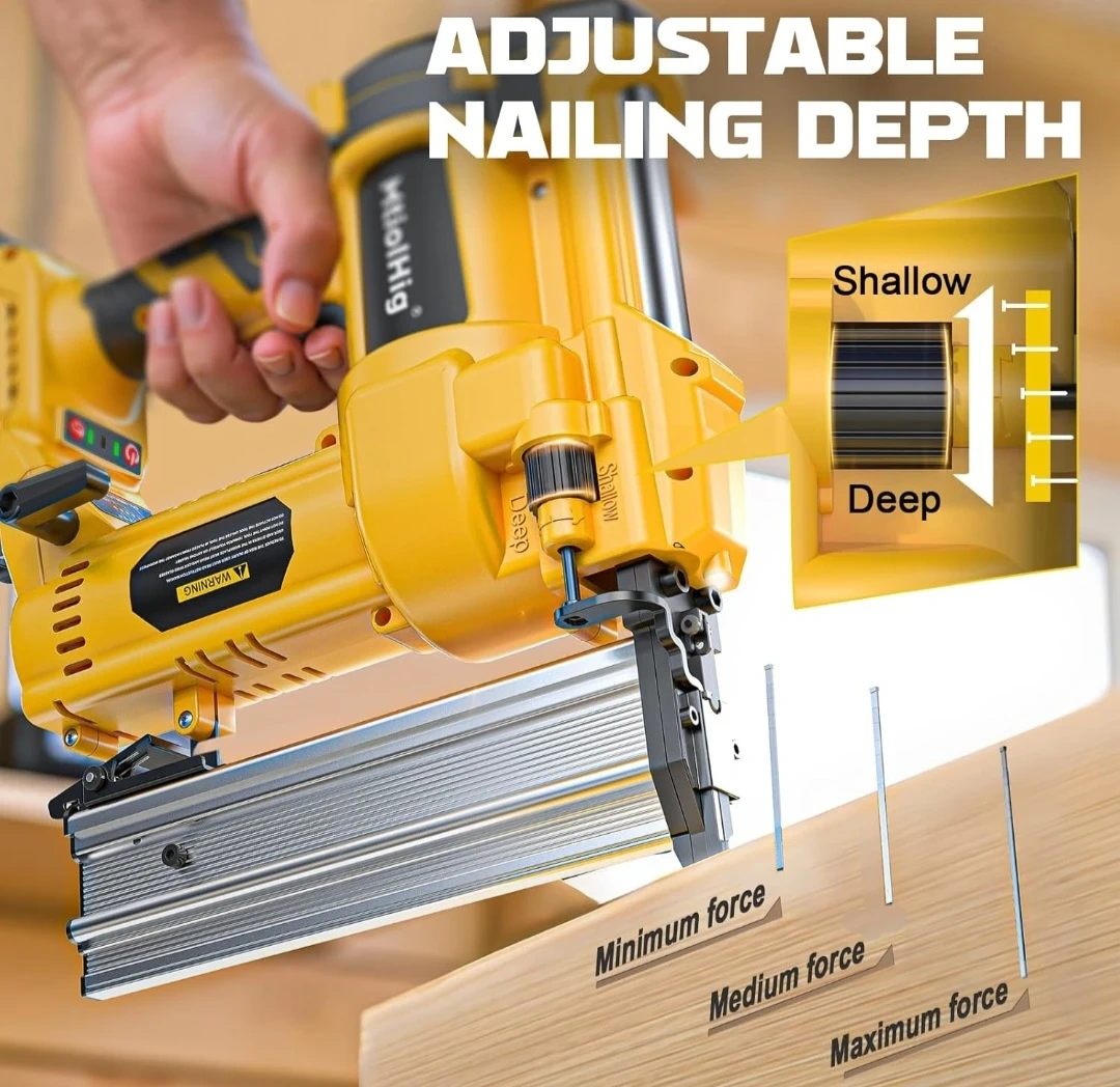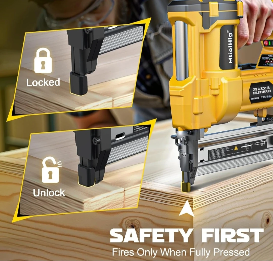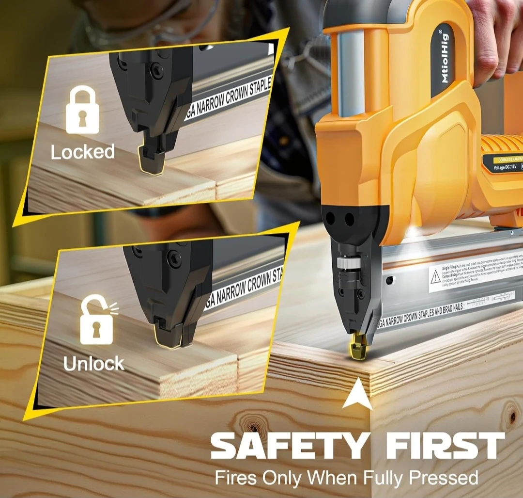 This MtiolHig 2-in-1 cordless nailer works as both a brad nailer and a staple gun. It features adjustable nailing depth and two nailing modes: single fire and contact fire. Straight nails are 3/4" - 2" and staple nails are 3/4" - 1-5/8".