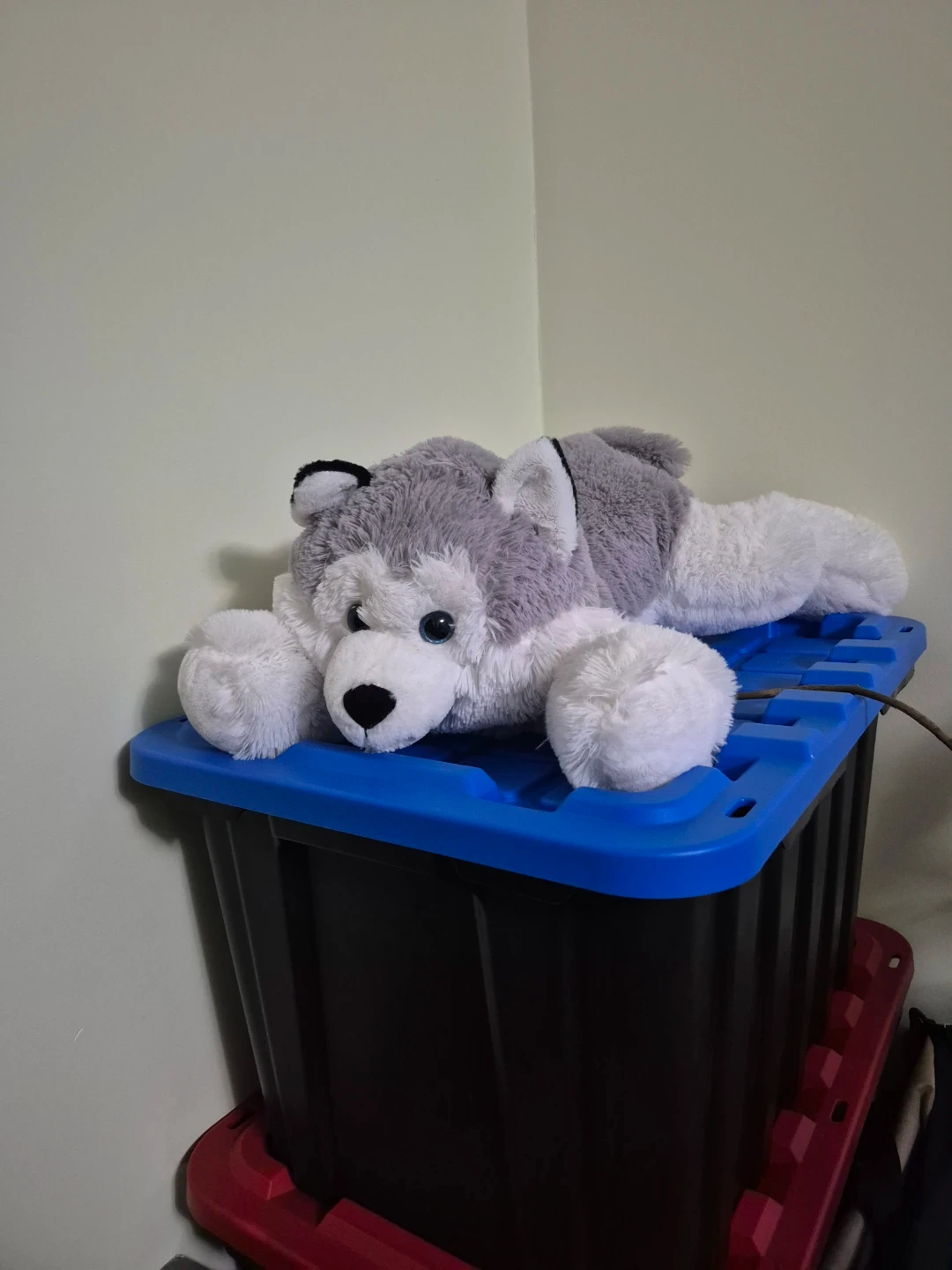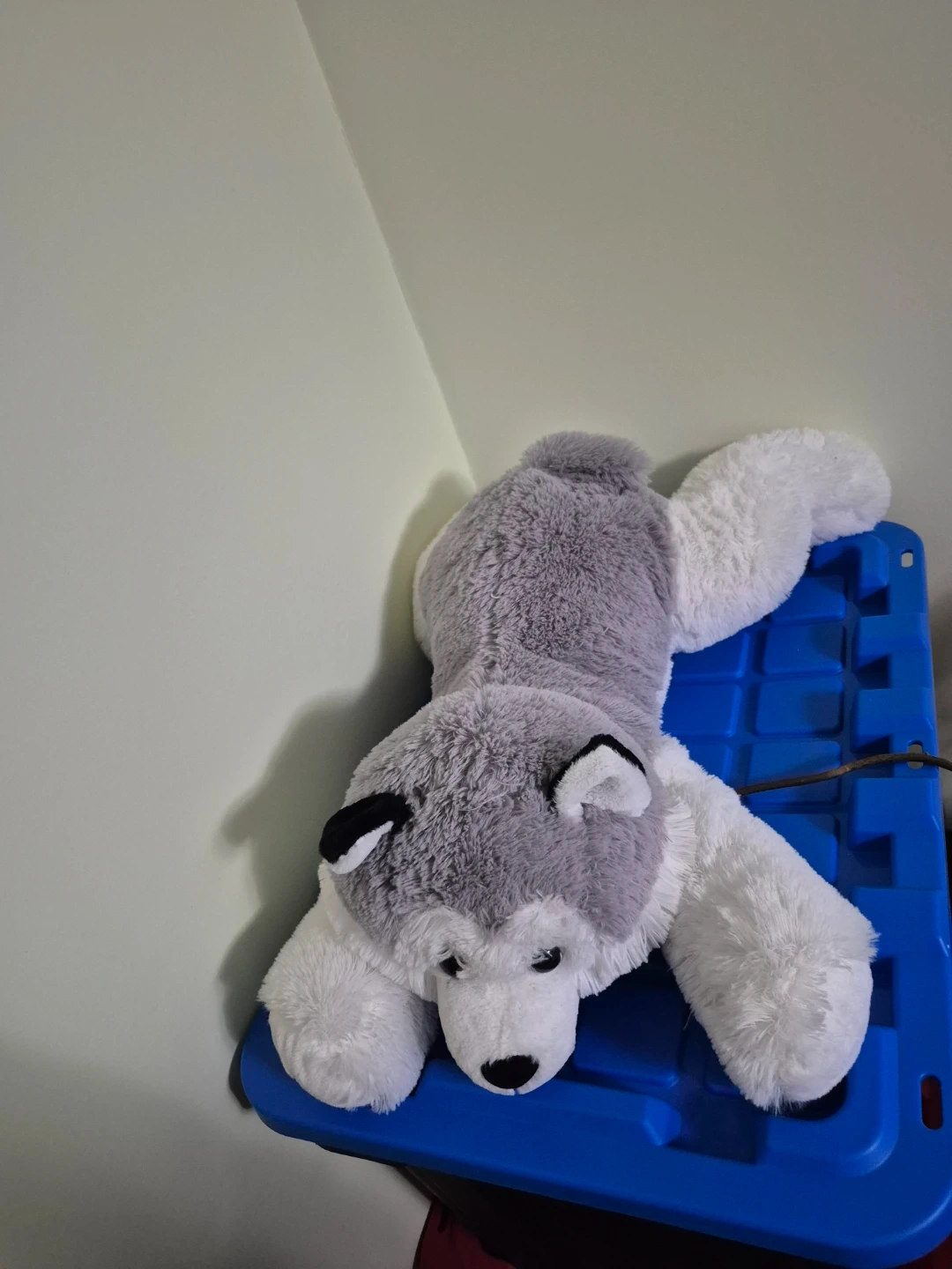 Not used, This is a soft and cuddly plush husky stuffed animal. It's grey and white with blue eyes. It's a good size for hugging!
