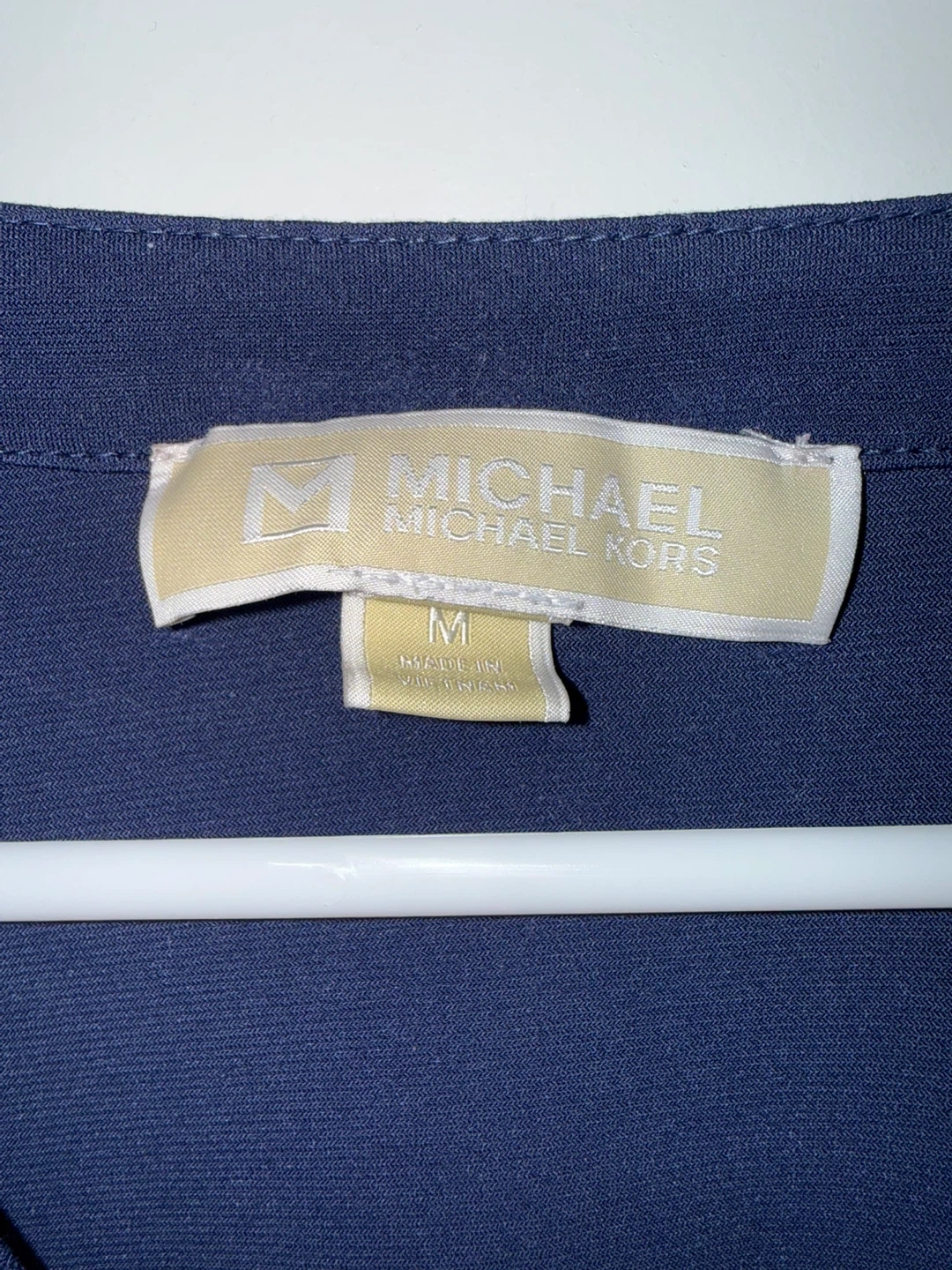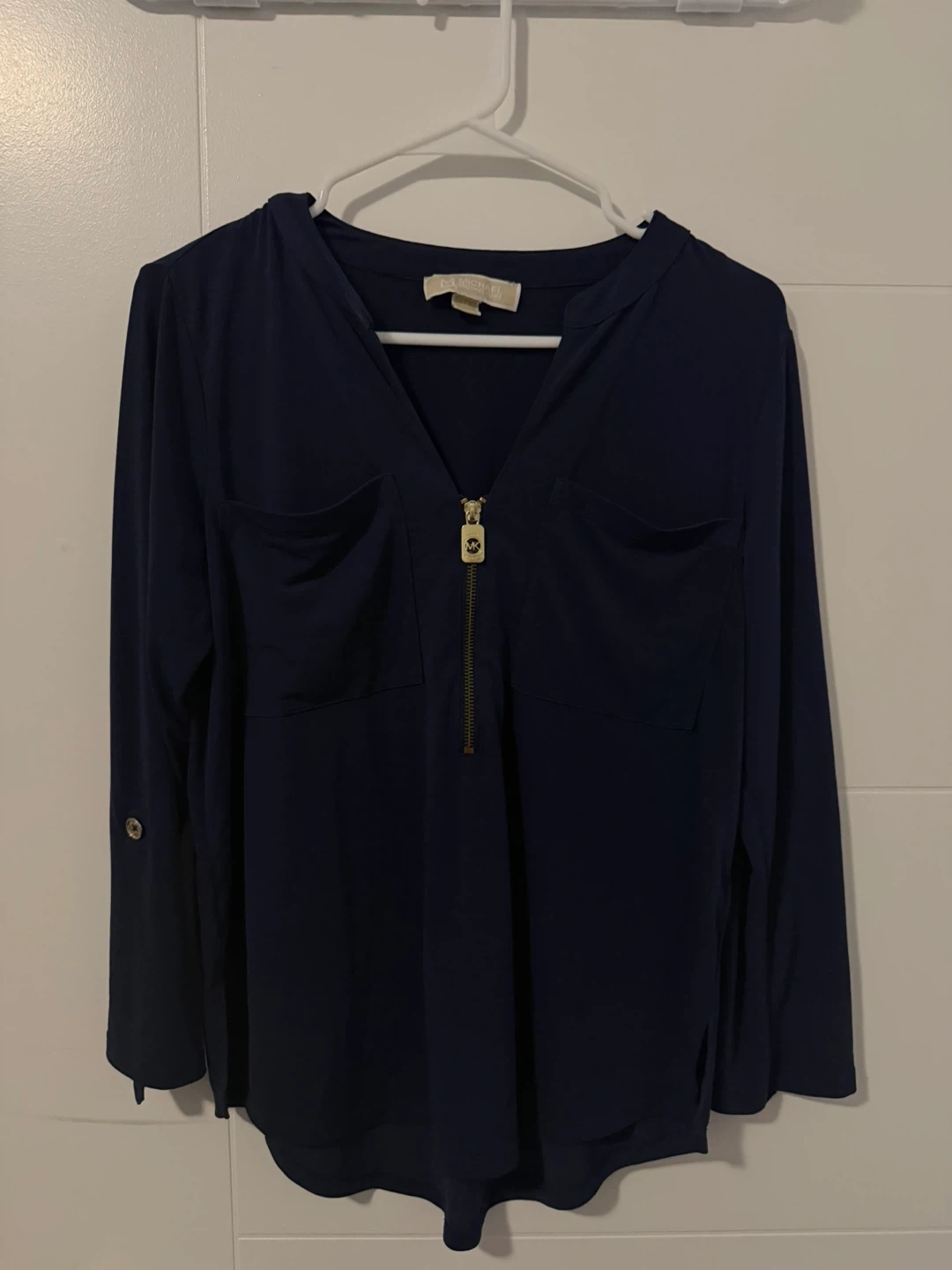 A stylish navy blue blouse from Michael Kors. It features a zip-neck detail and two front pockets. Size medium.