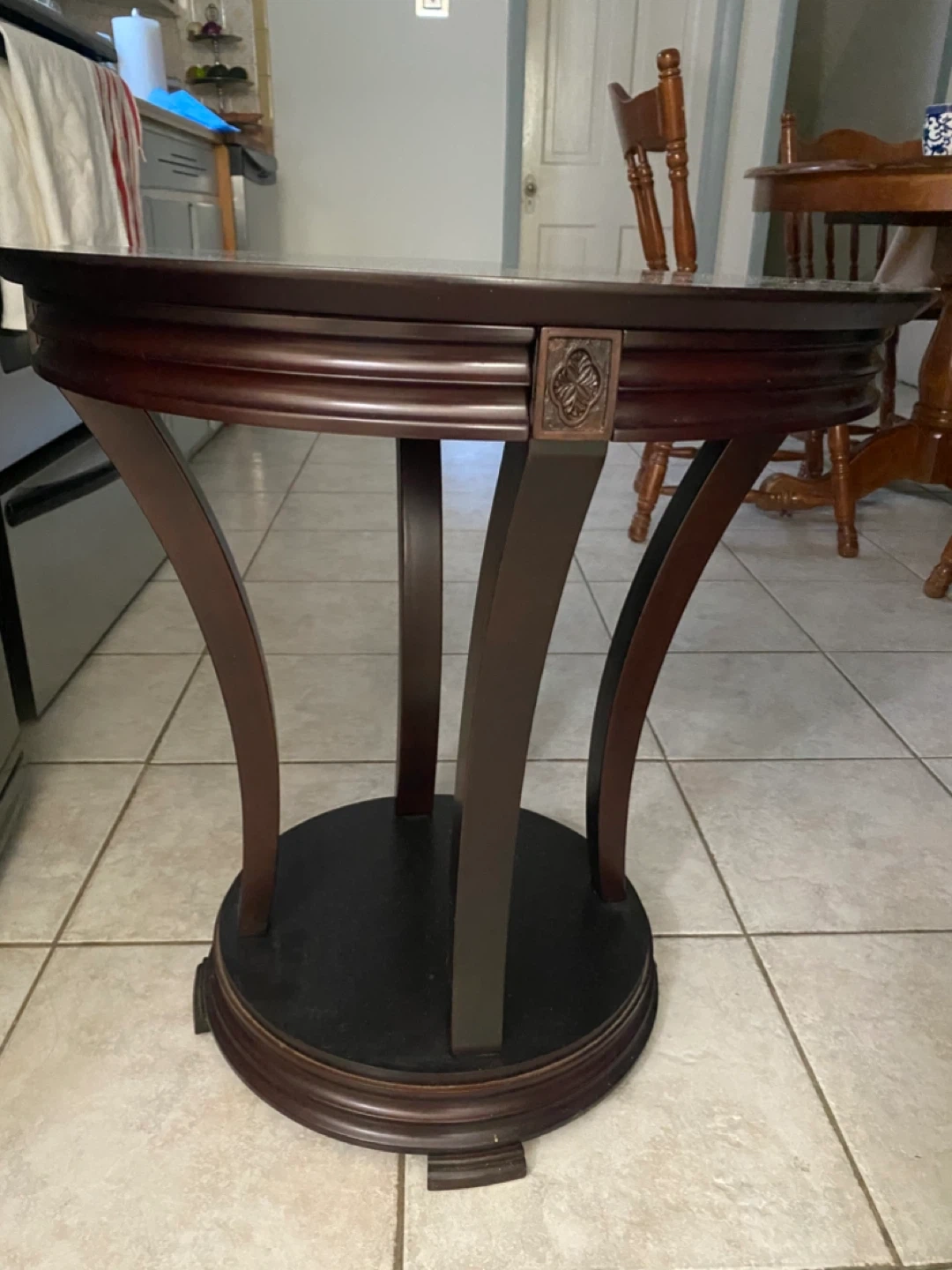 This round accent table is made of dark wood with a decorative carved detail on the apron. It has a lower shelf for additional storage or display. Minor damage to one of the base supports is visible. Has some minor scratches.