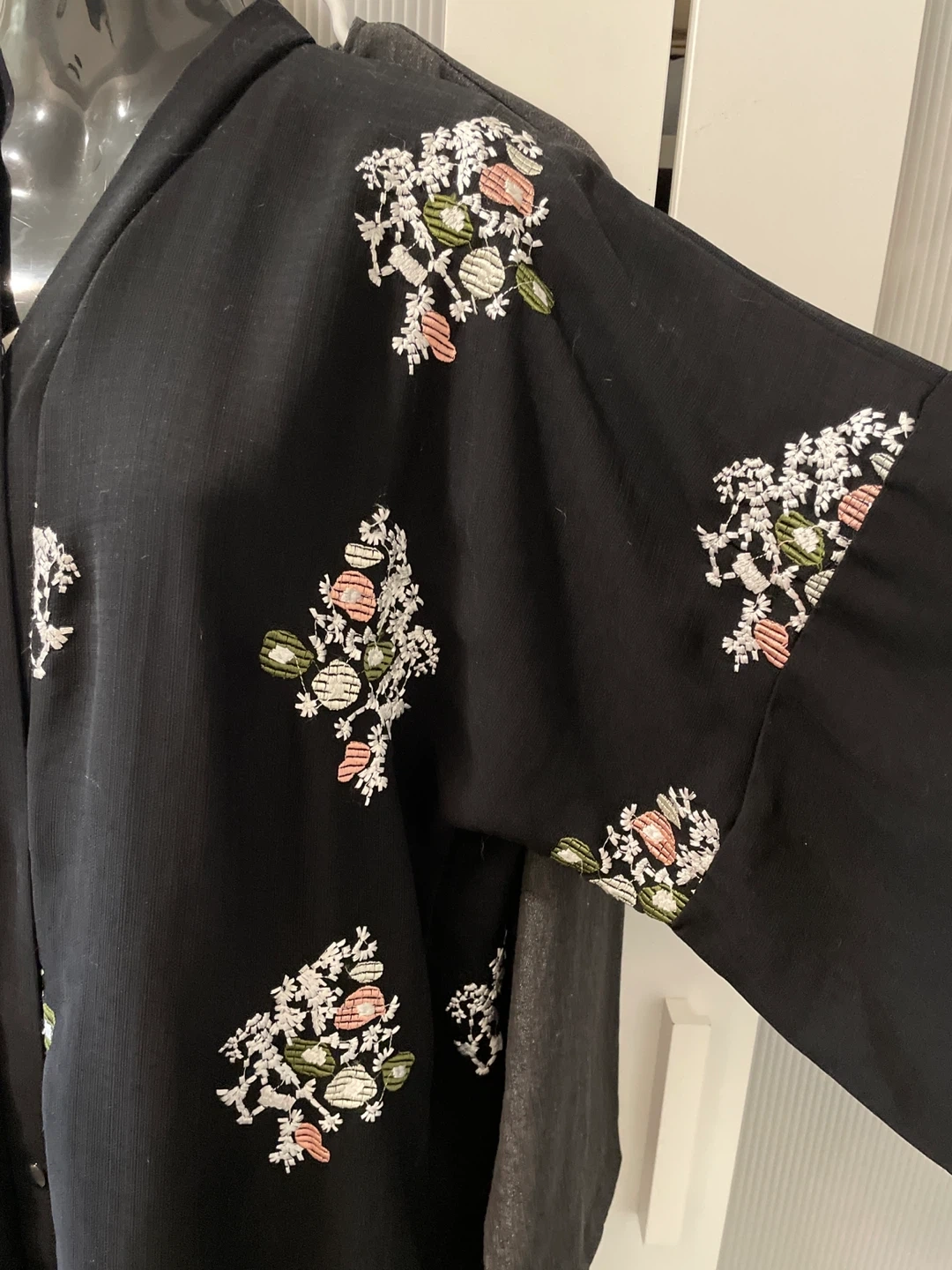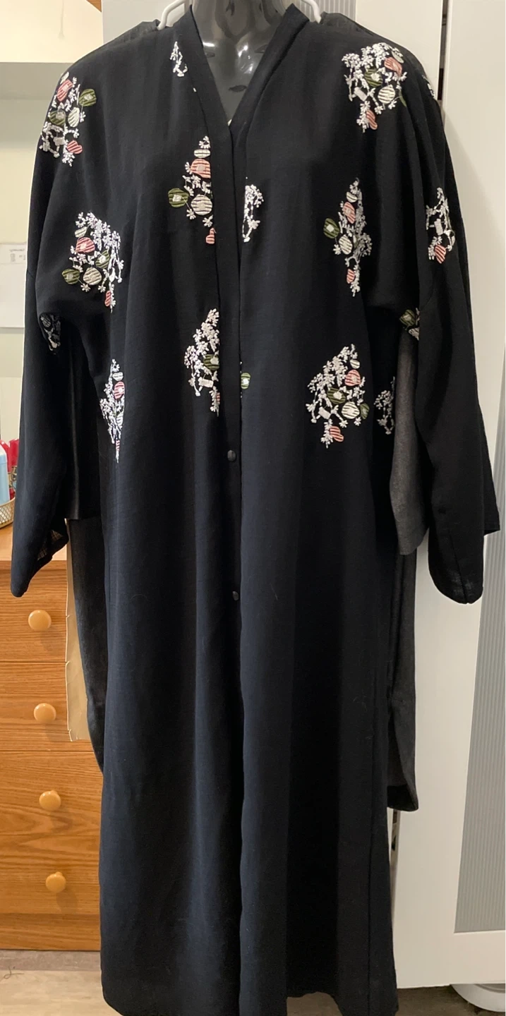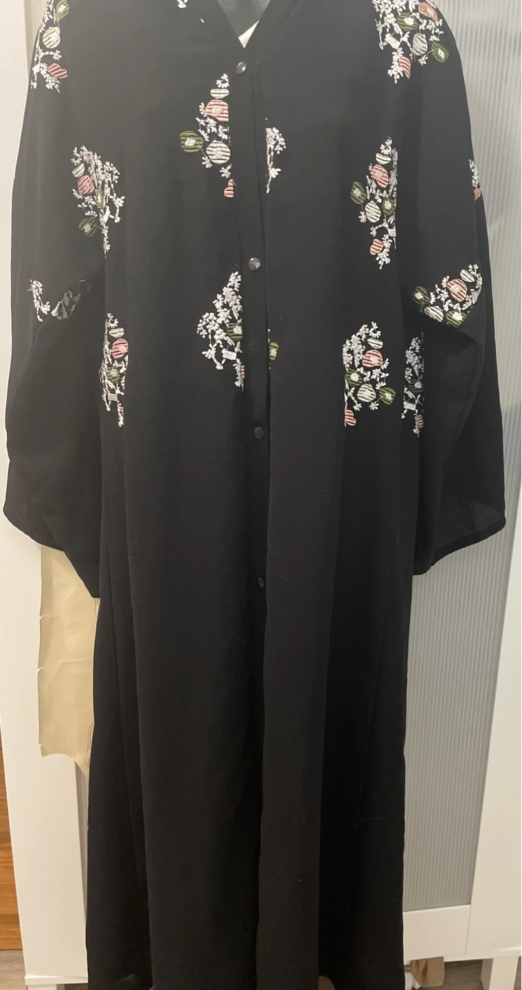 This is a black abaya with floral embroidery on the sleeves and front. It features a v-neckline and button-up front. The embroidery has white, pink, and green accents.