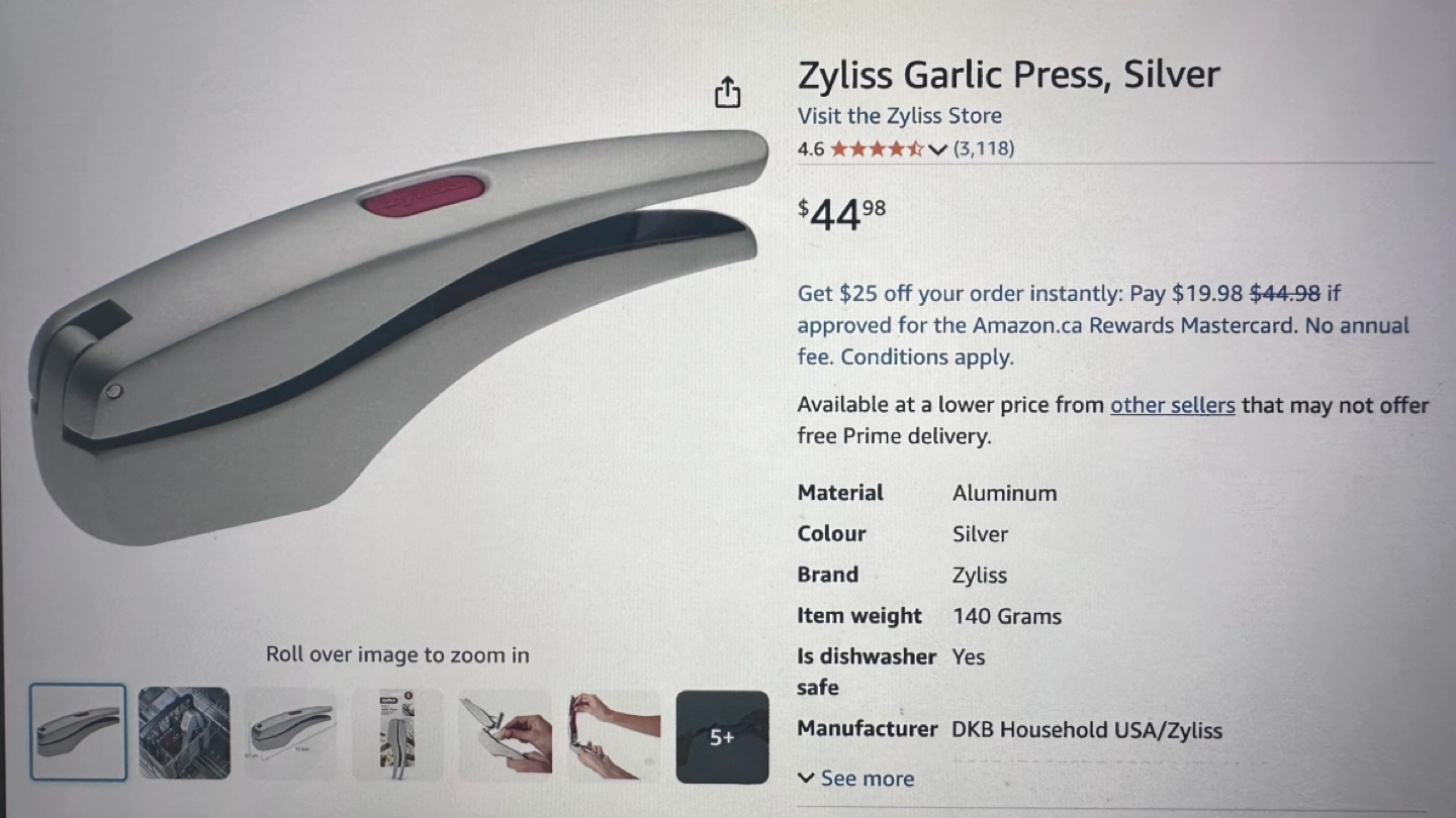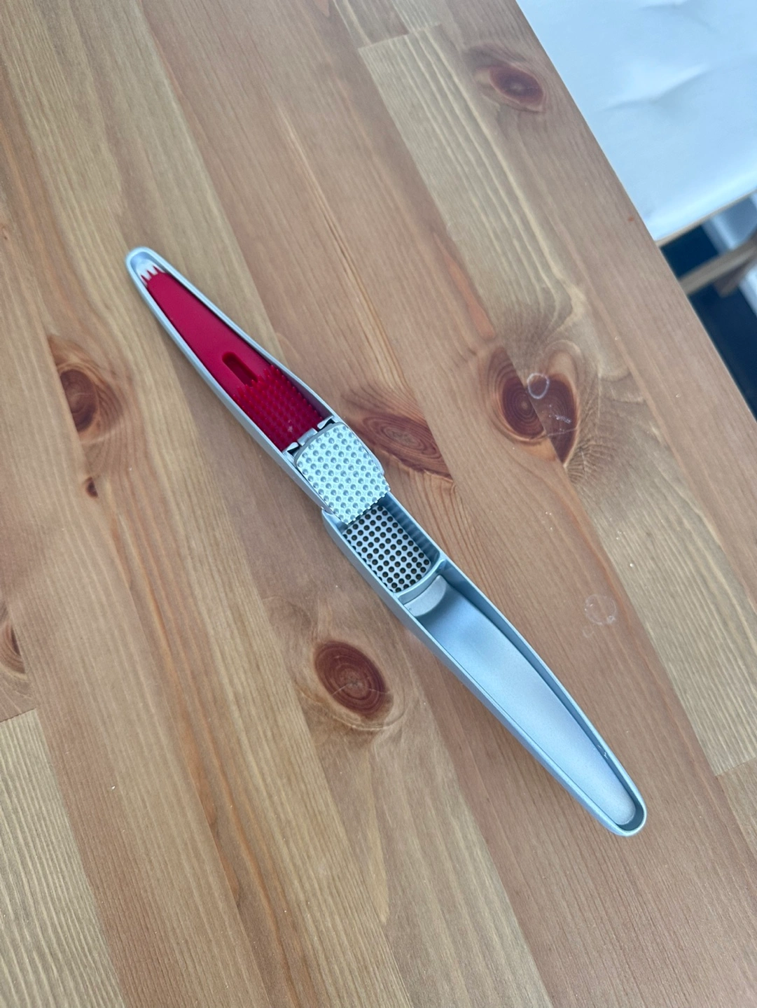 529* Press several garlic cloves at once with this oversized press * Its powerful, specially designed plunger removes the peelings and quickly extracts garlic bits and juice * No need to peel your garlic before you press it—this tool can press cloves with the skin on or off * The handle is ergonomically designed for better leverage and easy squeezing, and the nonstick coating is odor resistant
