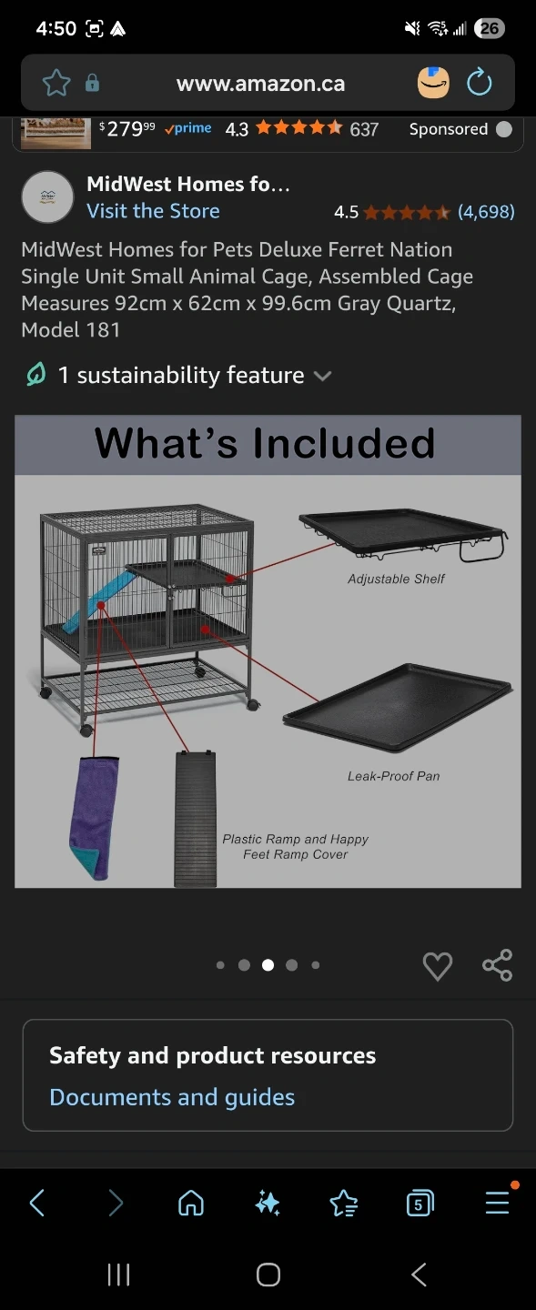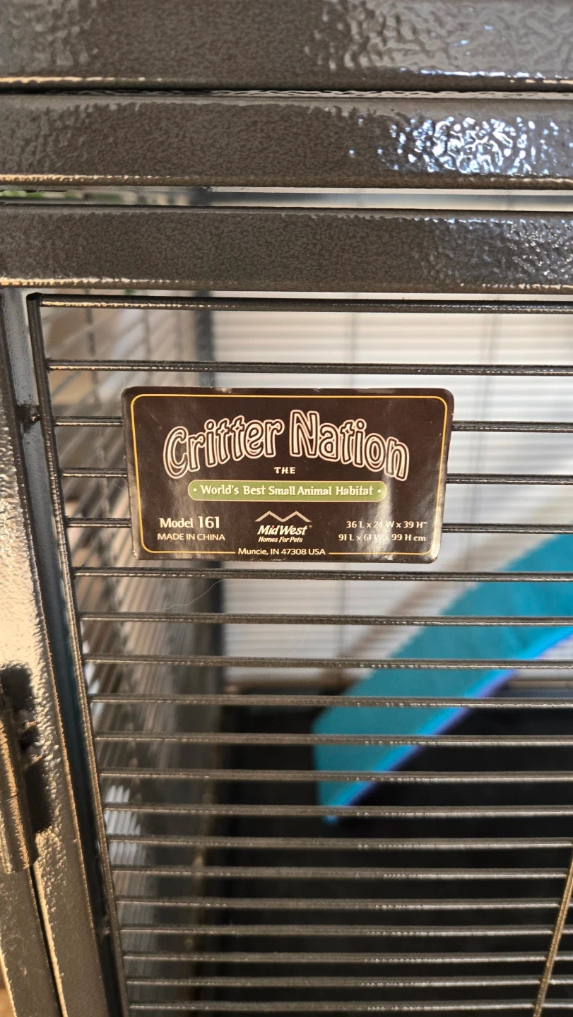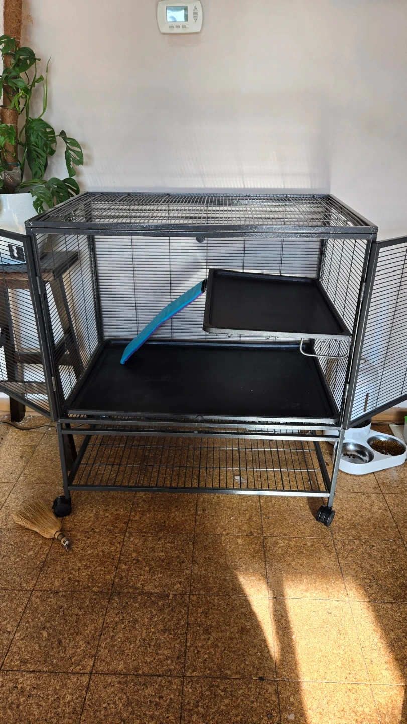 This cage is designed for small animals like ferrets. It includes adjustable shelves and a leak-proof pan. The dimensions are 36 L x 24 W x 39 H inches.