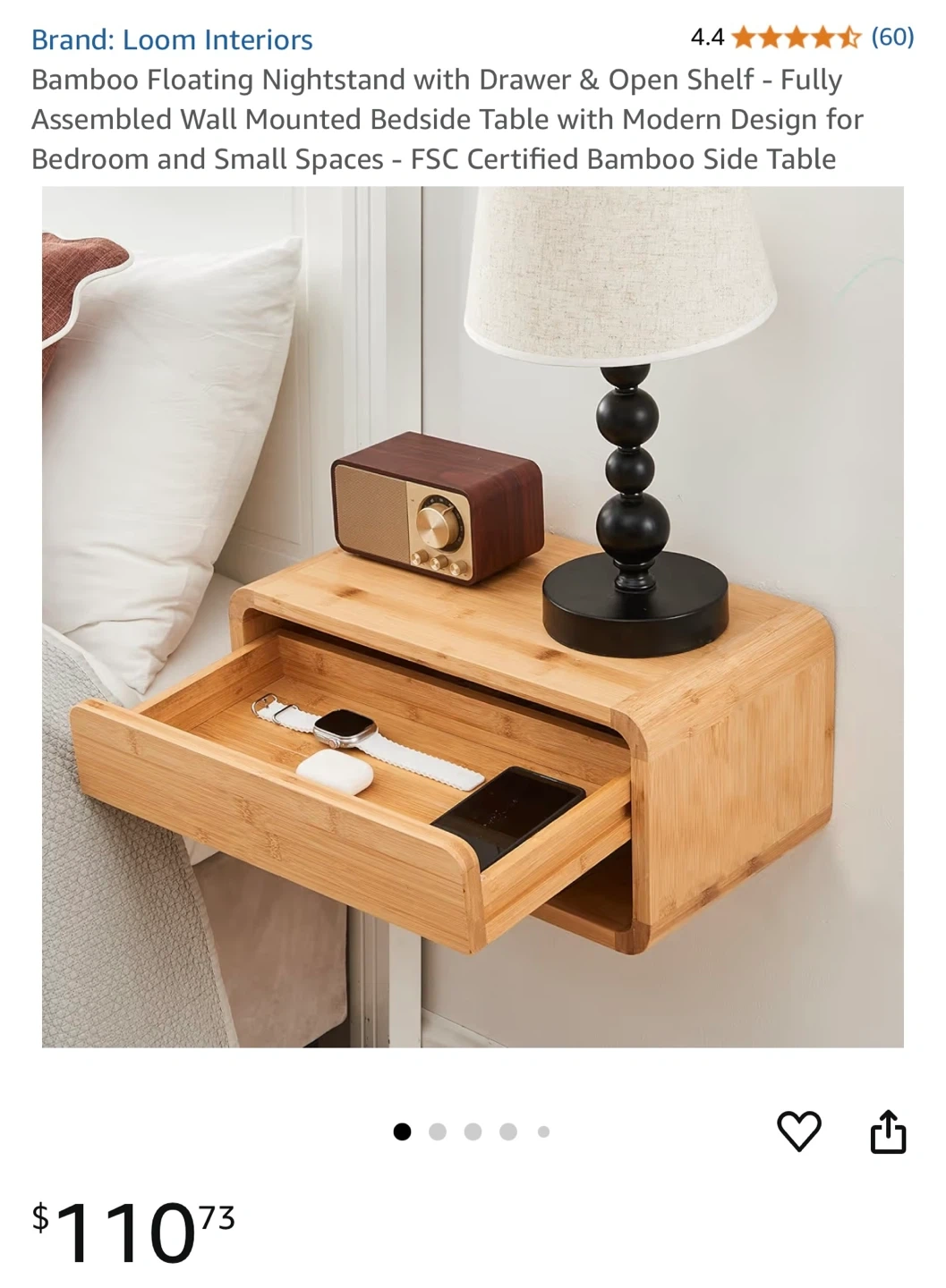 This bamboo nightstand from Loom Interiors features a drawer and an open shelf for storage. It's designed to be mounted on the wall, perfect for bedrooms or small spaces.