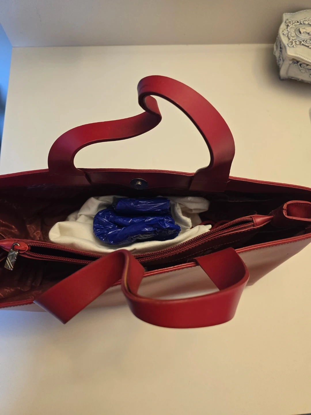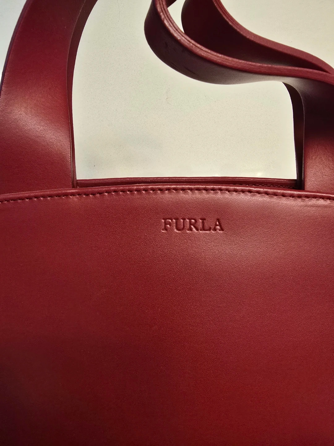 A classic red leather tote bag from Furla. It features a spacious interior with zippered and slip pockets. This bag is made from smooth leather.