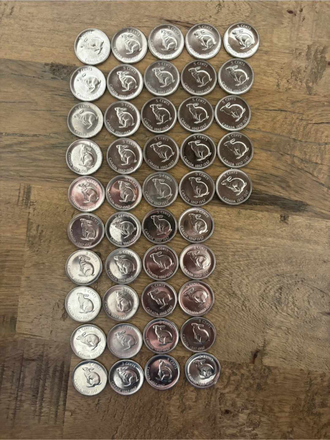 Lot of 1967 Canadian Centennial 5-cent coins featuring the rabbit design.