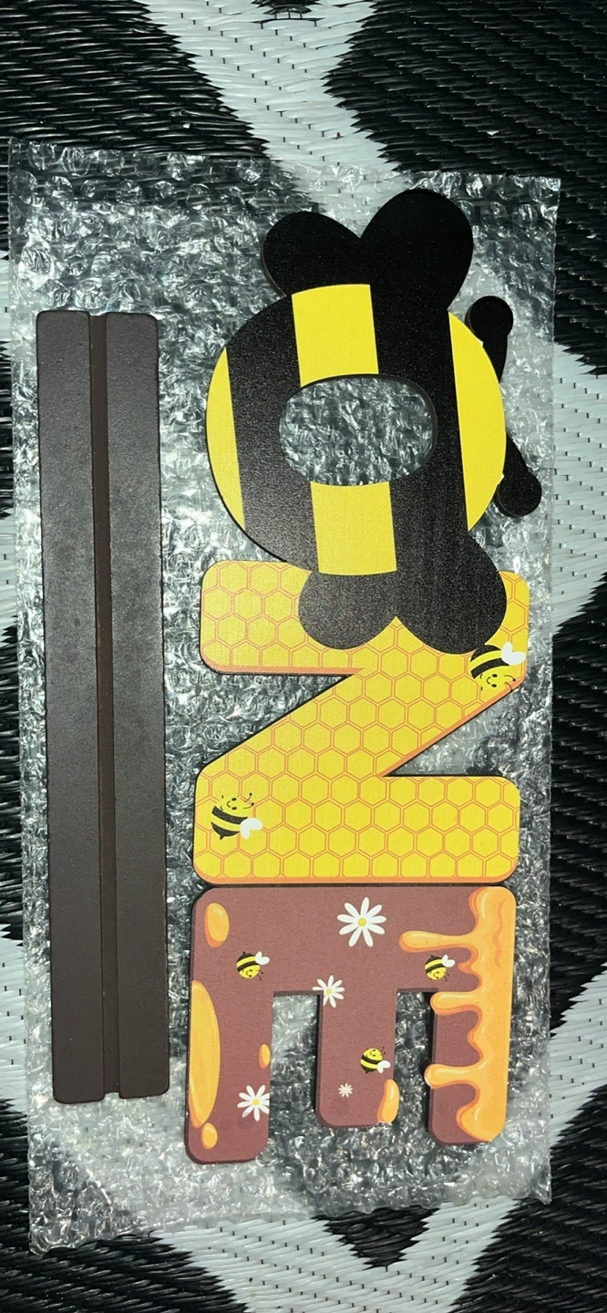 This 'ONE' sign features a bee theme, complete with cute bees, a honeycomb pattern, and honey drips. It is accompanied by a stand, making it suitable for use as a decoration for a first birthday party or a nursery. Pick up naer pape and Danforth please and thank you.