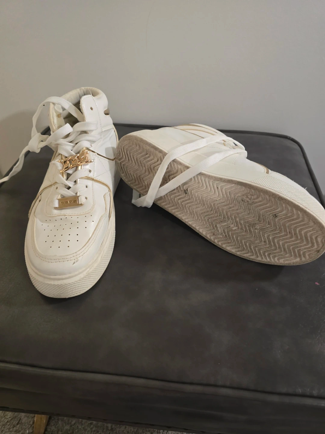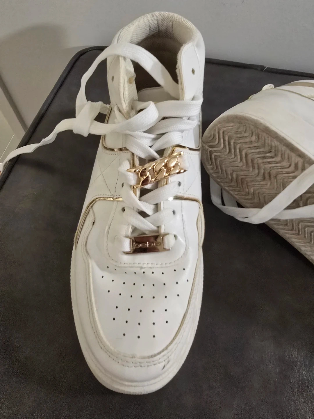 Selling a pair of Bebe Monah high-top sneakers in white! They are a US size 7.5. The upper and sole are made of synthetic materials. They have a stylish gold chain detail.