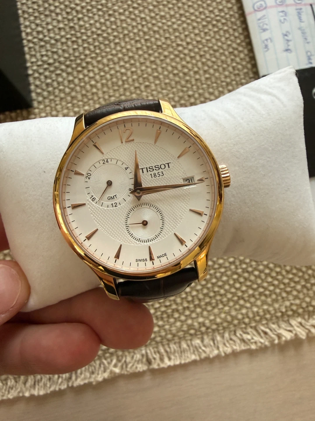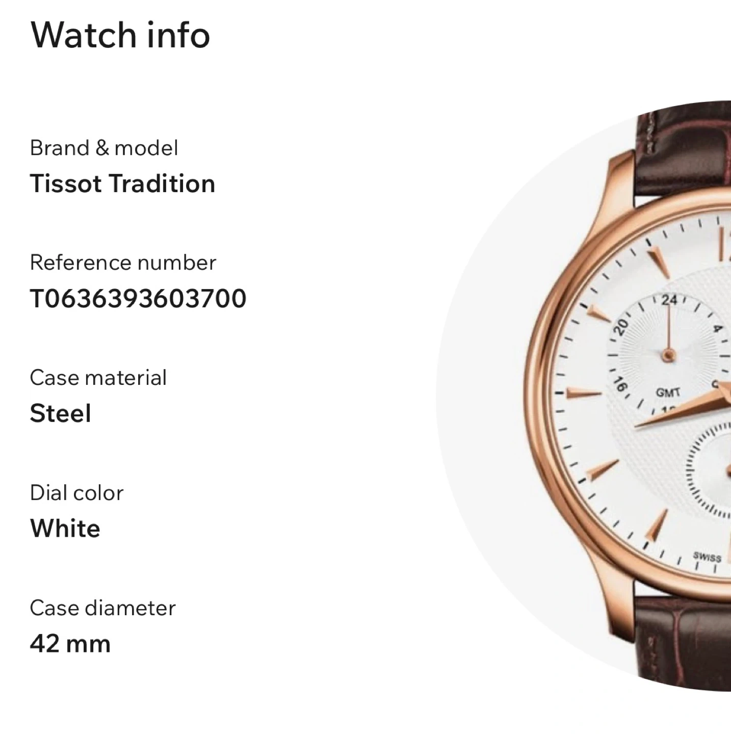 Tissot Tradition GMT quartz watch with a white dial and rose gold PVD stainless steel case. It features a 42mm case diameter, sapphire crystal, and 3 ATM water resistance.