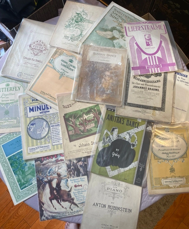 Collection of vintage classical sheet music from the 1900s to 1950s. Features works by masters like Chopin, Mozart, Brahms, Grieg, and Beethoven. Most pieces are priced between $5 - $10 each, with over 10 available between $15 - $25. The entire collection is available, and I'm open to offers.
