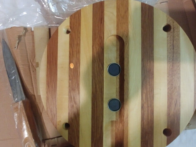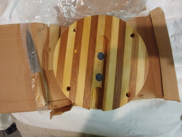 Up for sale, I have two new vintage wood cheese cutting boards made with Japan Wood, made in Japan. The boards are 11 inches by 2 inches and in brand new condition. They come with their original knife. Also included are 4X 2-inch screw-on wooden legs. They have an insert with a magnet under the board to put a knife. I have two for sale: one at $50 with legs and one at $45 without legs. They are one of a kind. For Sale By: Owner
