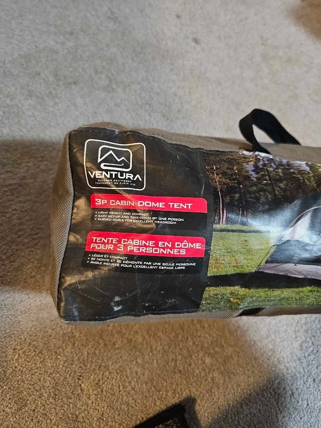 Get ready for your next outdoor adventure with this Ventura 3-person cabin dome tent, perfect for camping trips! This tent features a comfortable interior space and easy setup, making it ideal for both beginners and experienced campers alike. This item is in used condition - used it twice. Specifications: * Capacity: 3 person * Type: Cabin Dome Tent * Center Height: 42 inches. Located in Pickering.