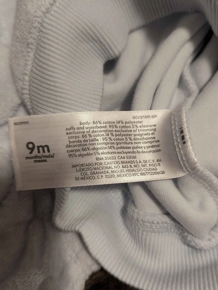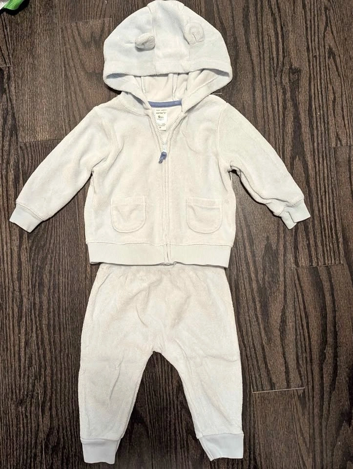 Carter’s baby outfit, size 9 months. Light blue hoodie with dog ears and matching pants with a dog face on the back. Full zip hoodie for easy dressing. Excellent condition.