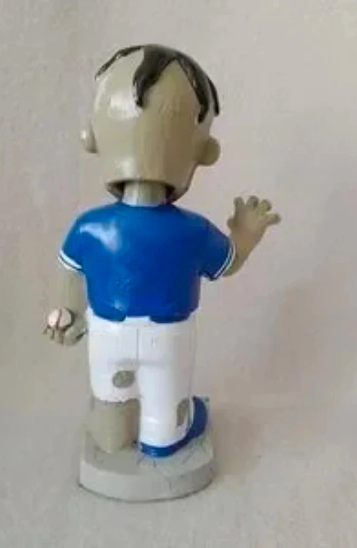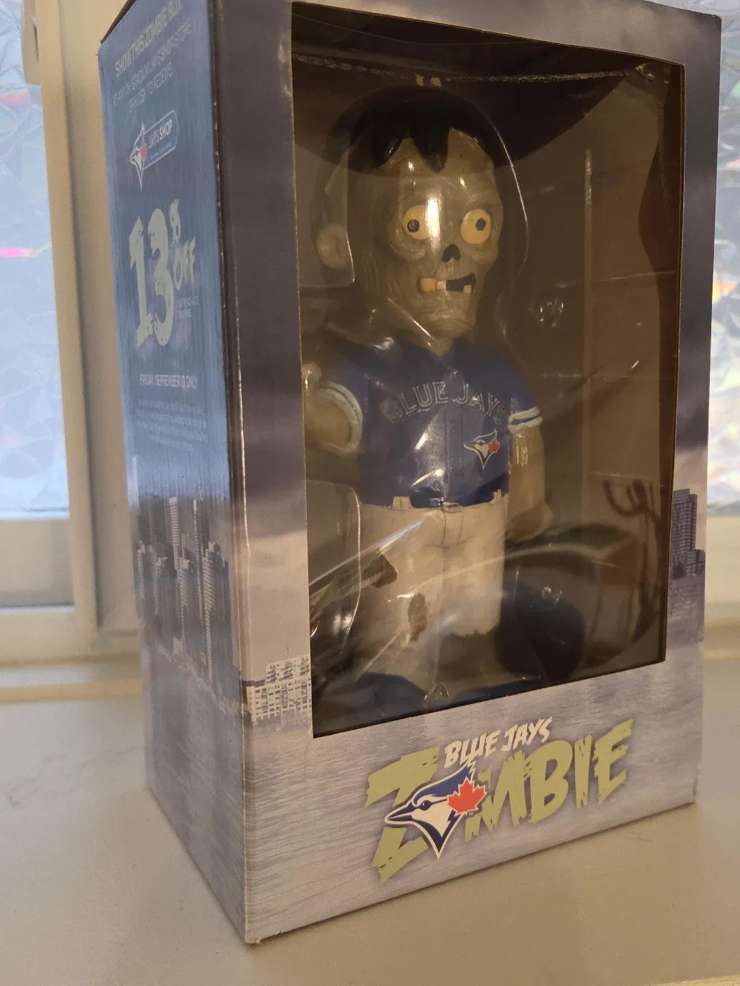 Zombie bobblehead wearing a Toronto Blue Jays uniform. It's in the original box. This unique collectible is a fun item for any Blue Jays fan!