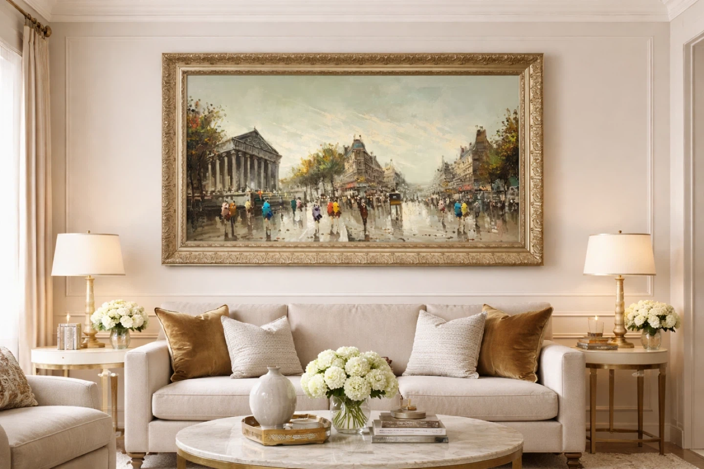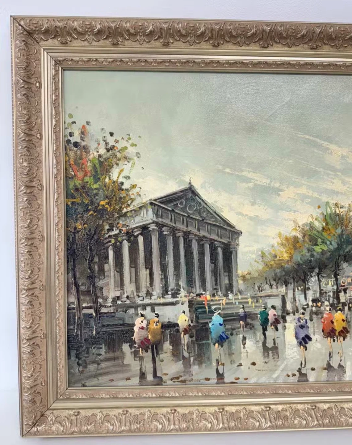 Oil painting depicting a bustling Parisian street scene with people carrying umbrellas. The artwork is housed in an ornate, gold-toned frame. This piece adds a touch of European charm to any space.