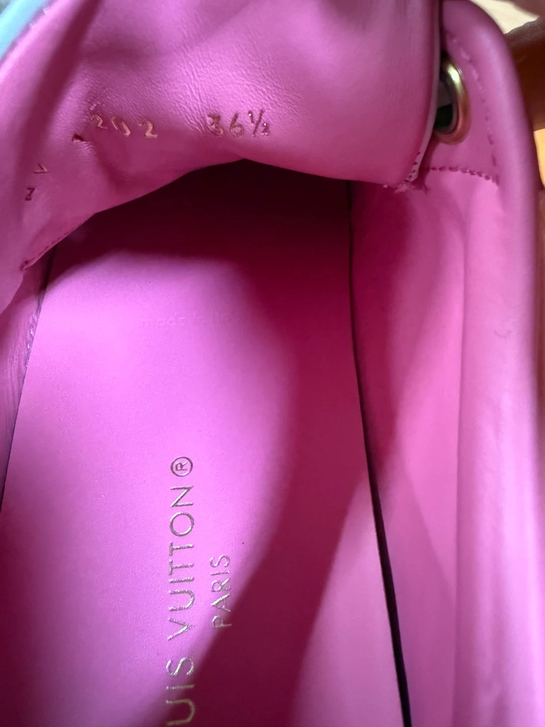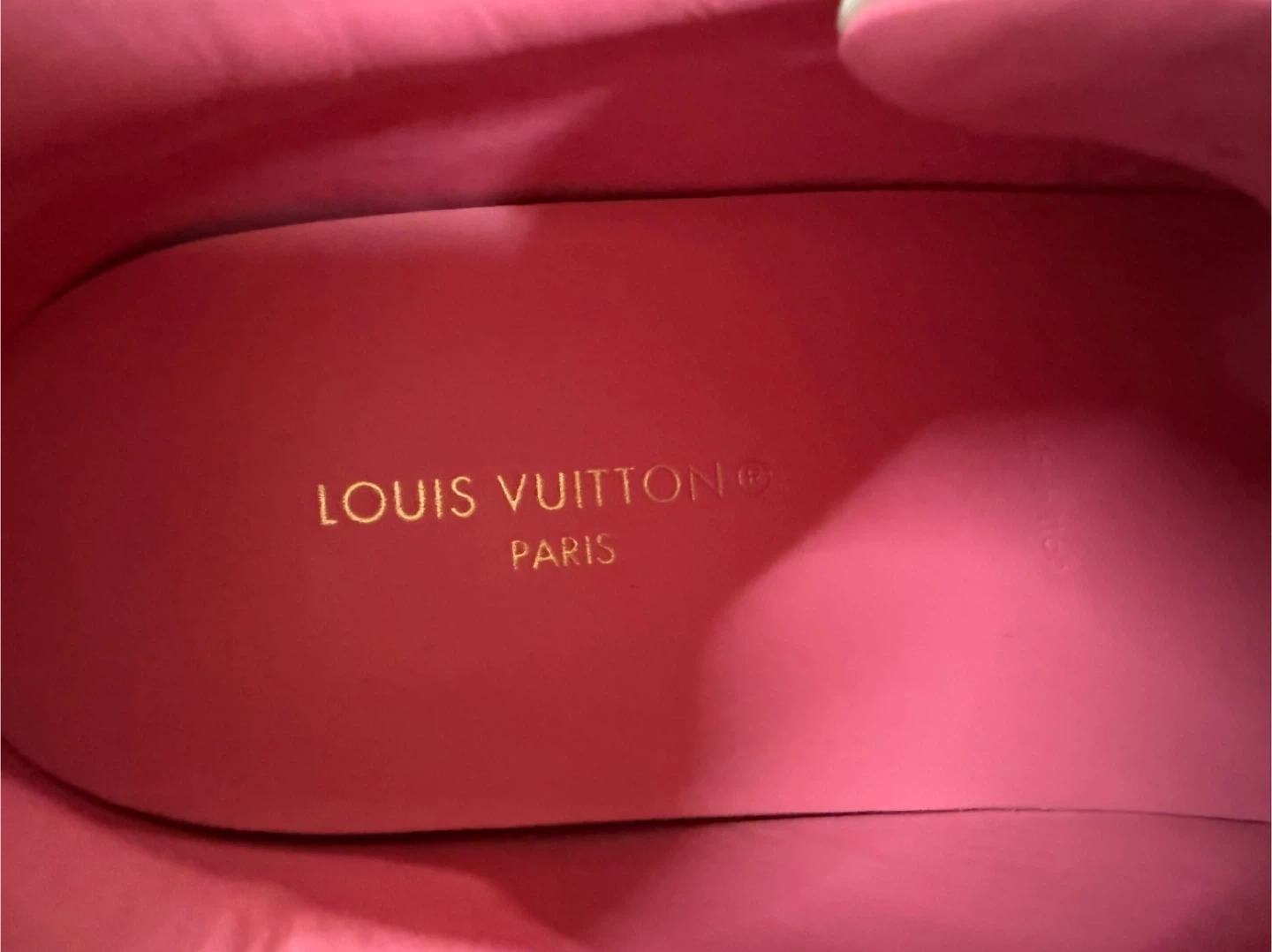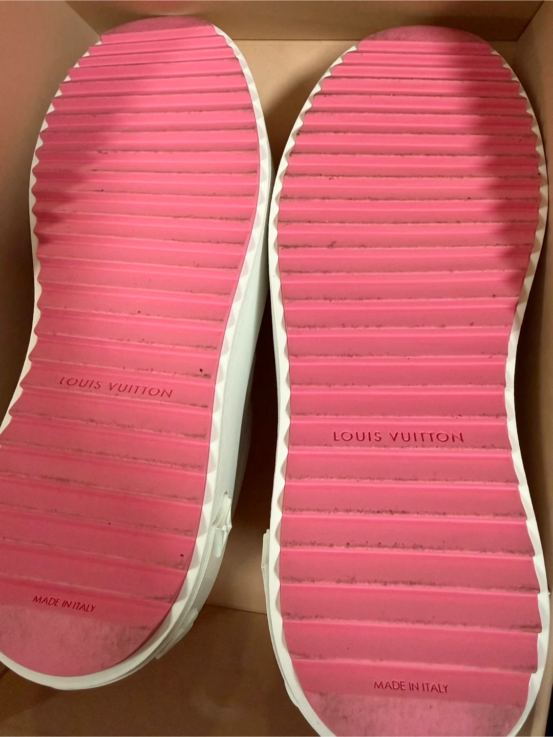 These Louis Vuitton sneakers are white with pink accents and feature the iconic monogram pattern