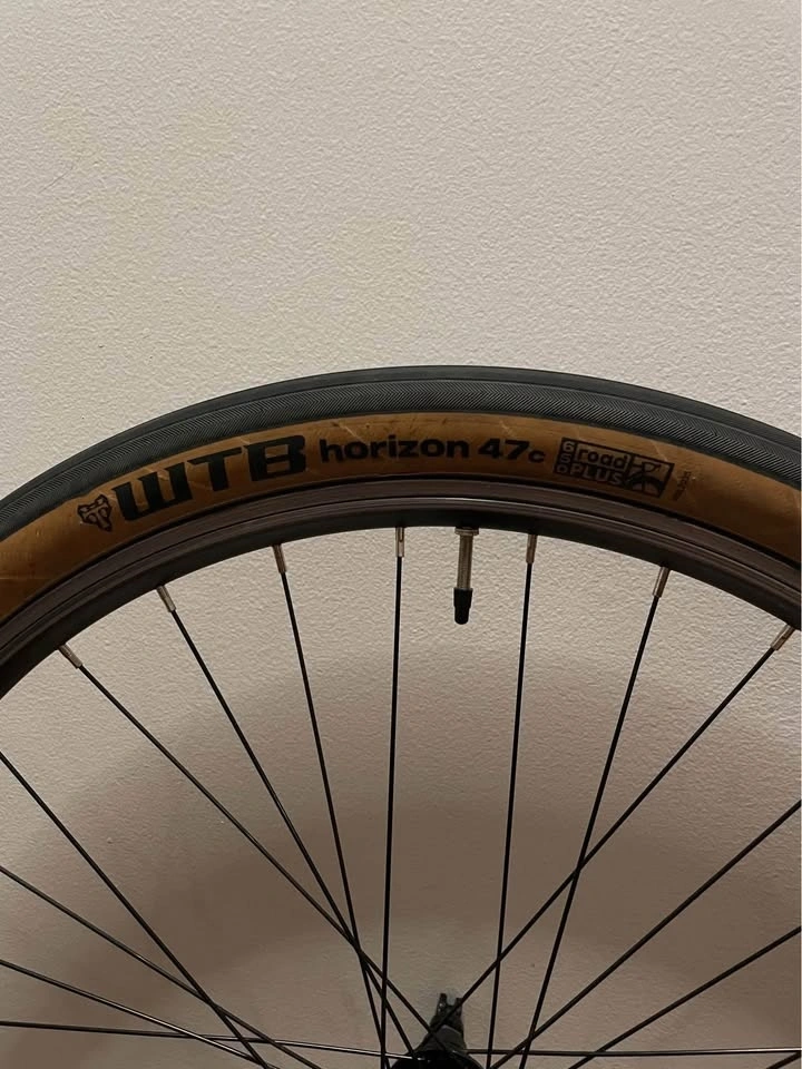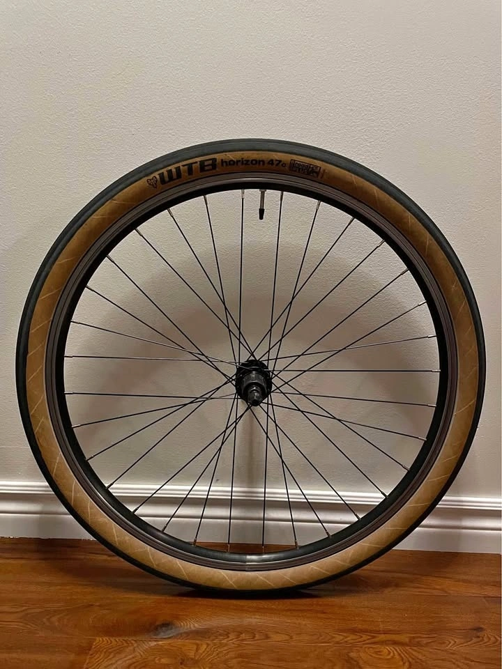 Rear wheel, size 27.5. Features a 135 mm quick release axle and is rim brake only (non-disc). The cassette body can fit up to a 9-speed. Comes with a WTB Horizon 650x47c tire. The axle is straight with no looseness.