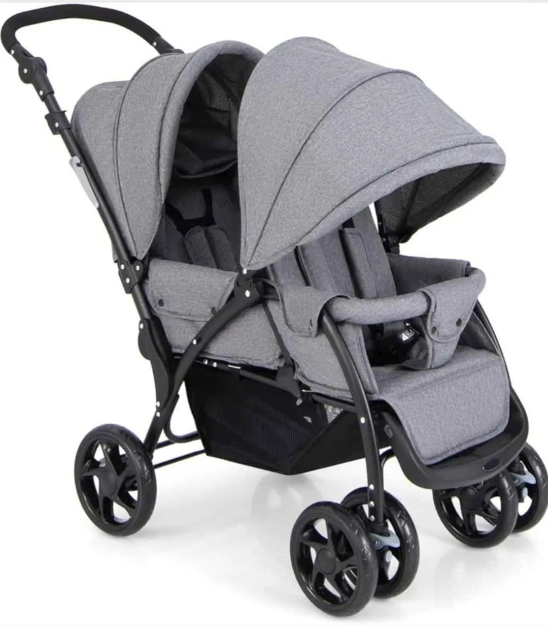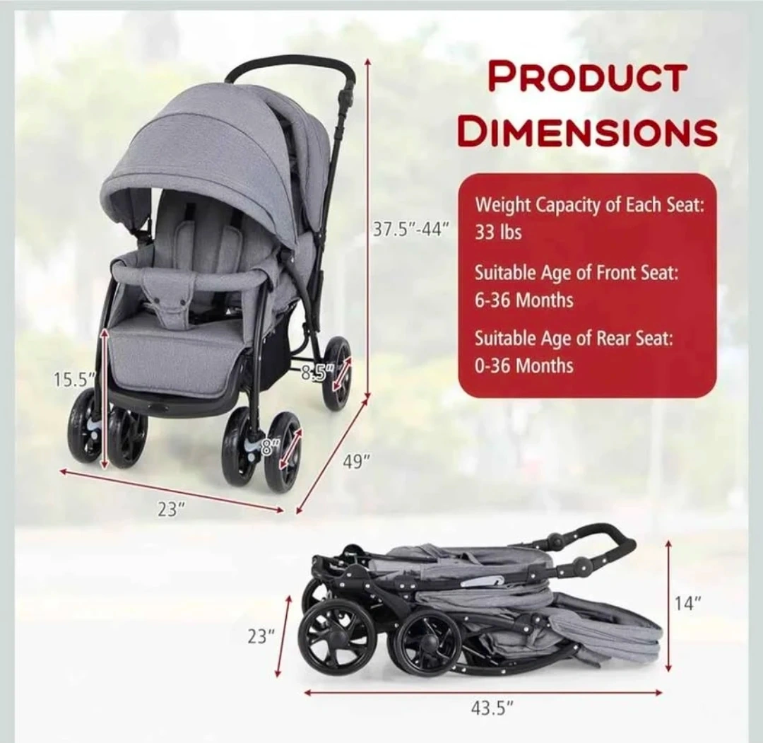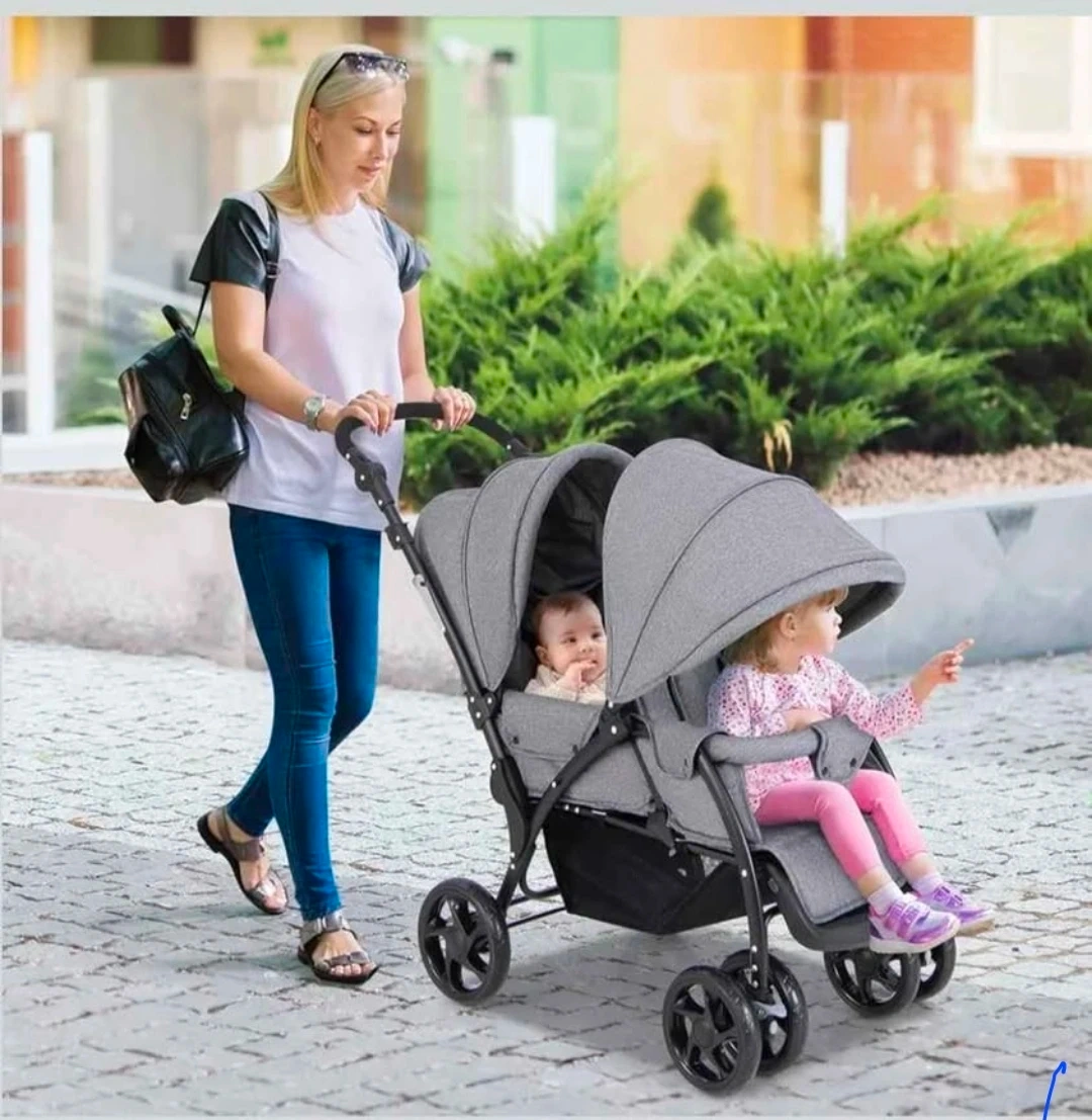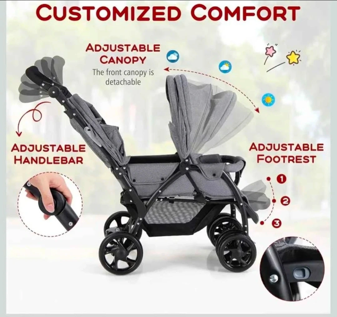 This double stroller is perfect for families with two young children! It features an adjustable canopy, adjustable handlebar, and adjustable footrest for customized comfort.