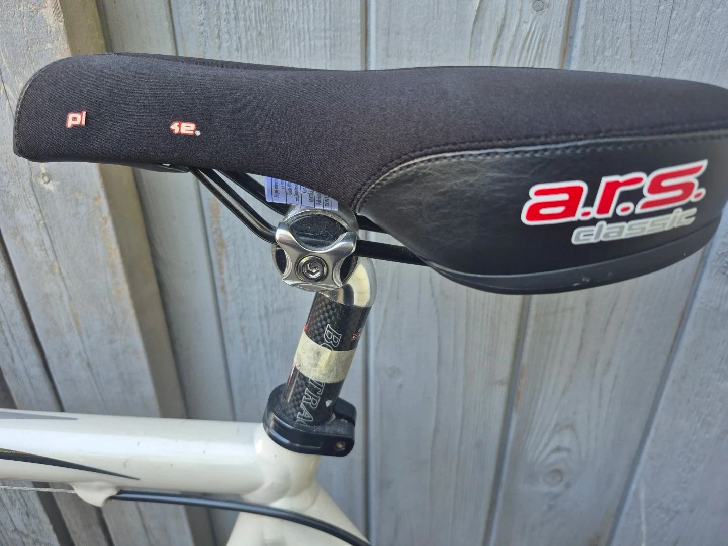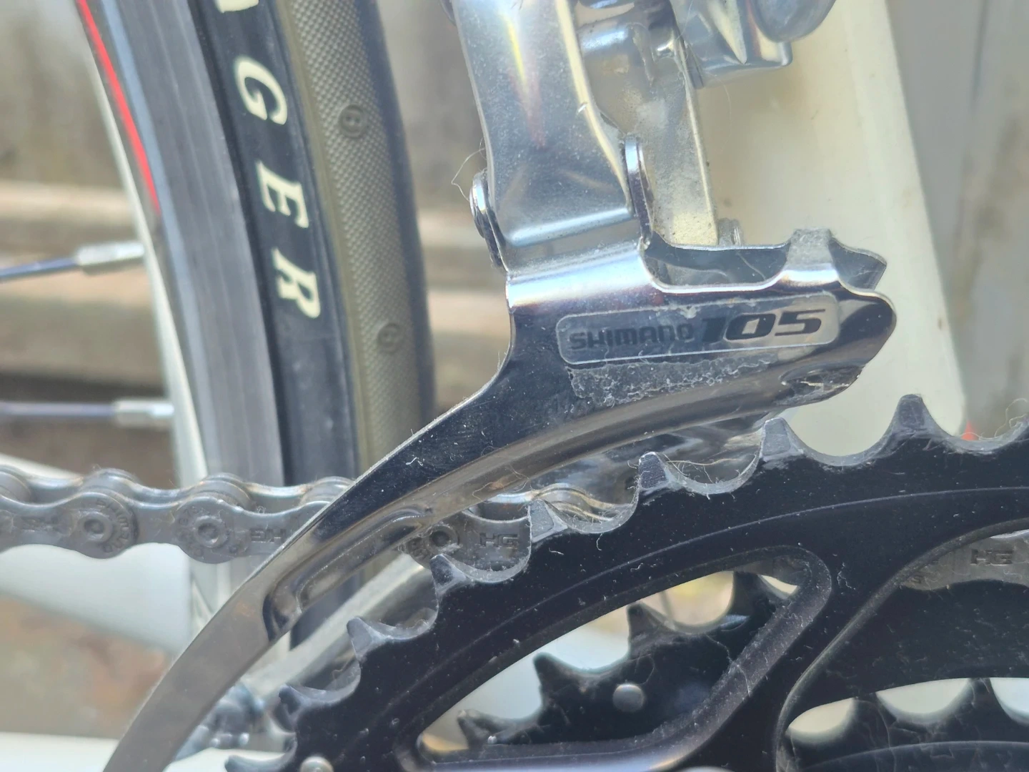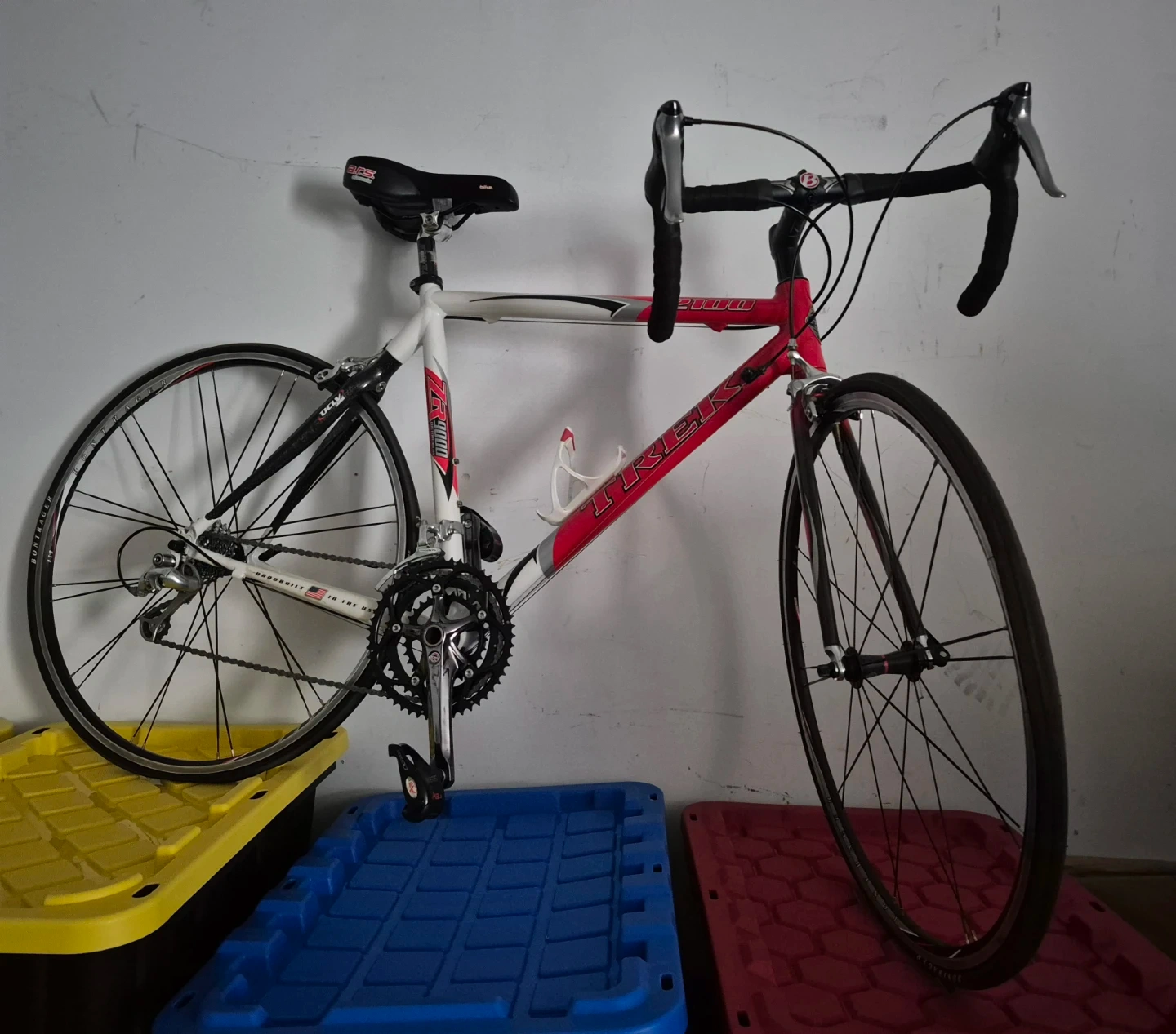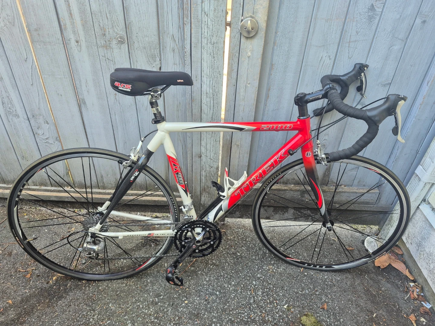 This is a red and white Trek 2000 road bike. It's equipped with drop handlebars and a water bottle cage. This bike's frame is made of aluminum.