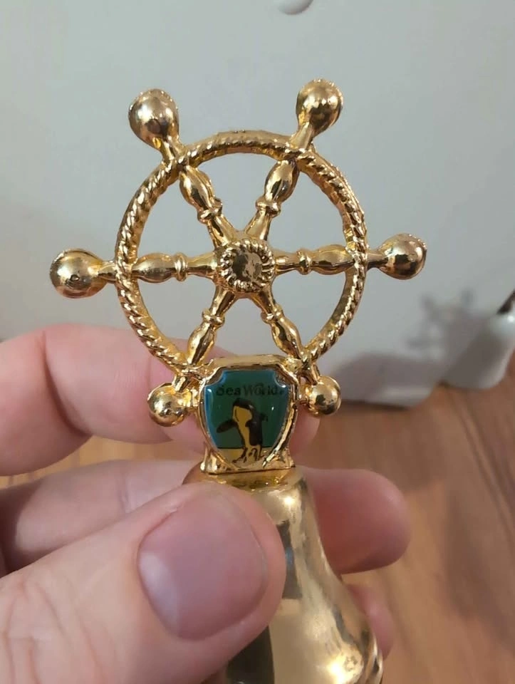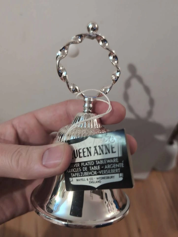 Collection of 7 decorative hand bells including nautical, harp, fruit, and souvenir styles. One is a Queen Anne silver-plated bell made in England (Mayell & Co.). Great for collectors, décor, or crafting. $45 for the set. Pickup: Surrey Central, Guildford Mall, or New Westminster Quay.