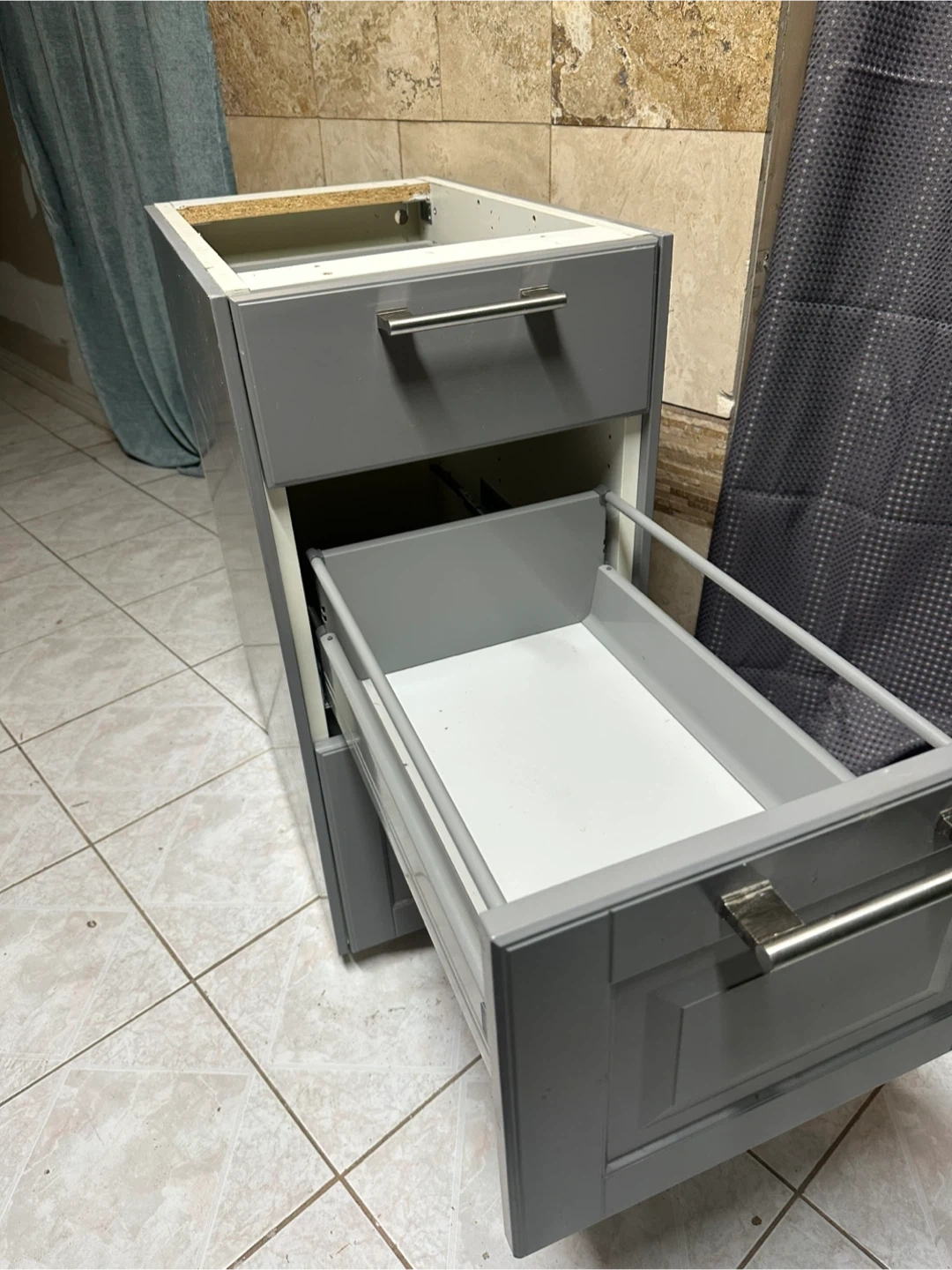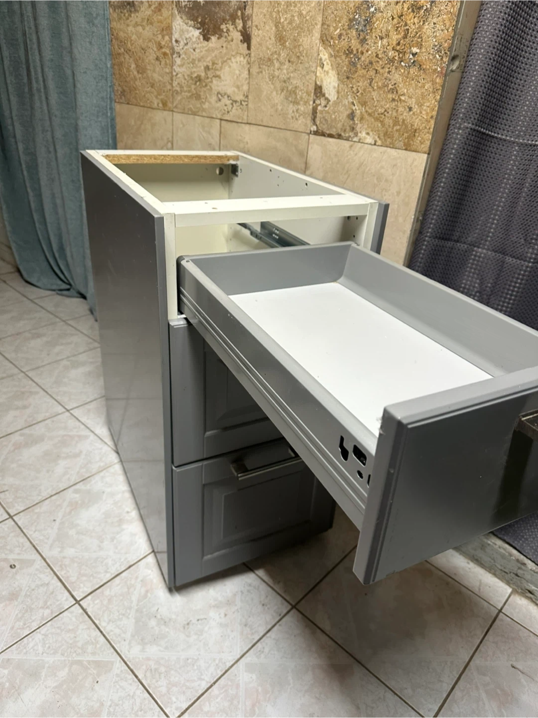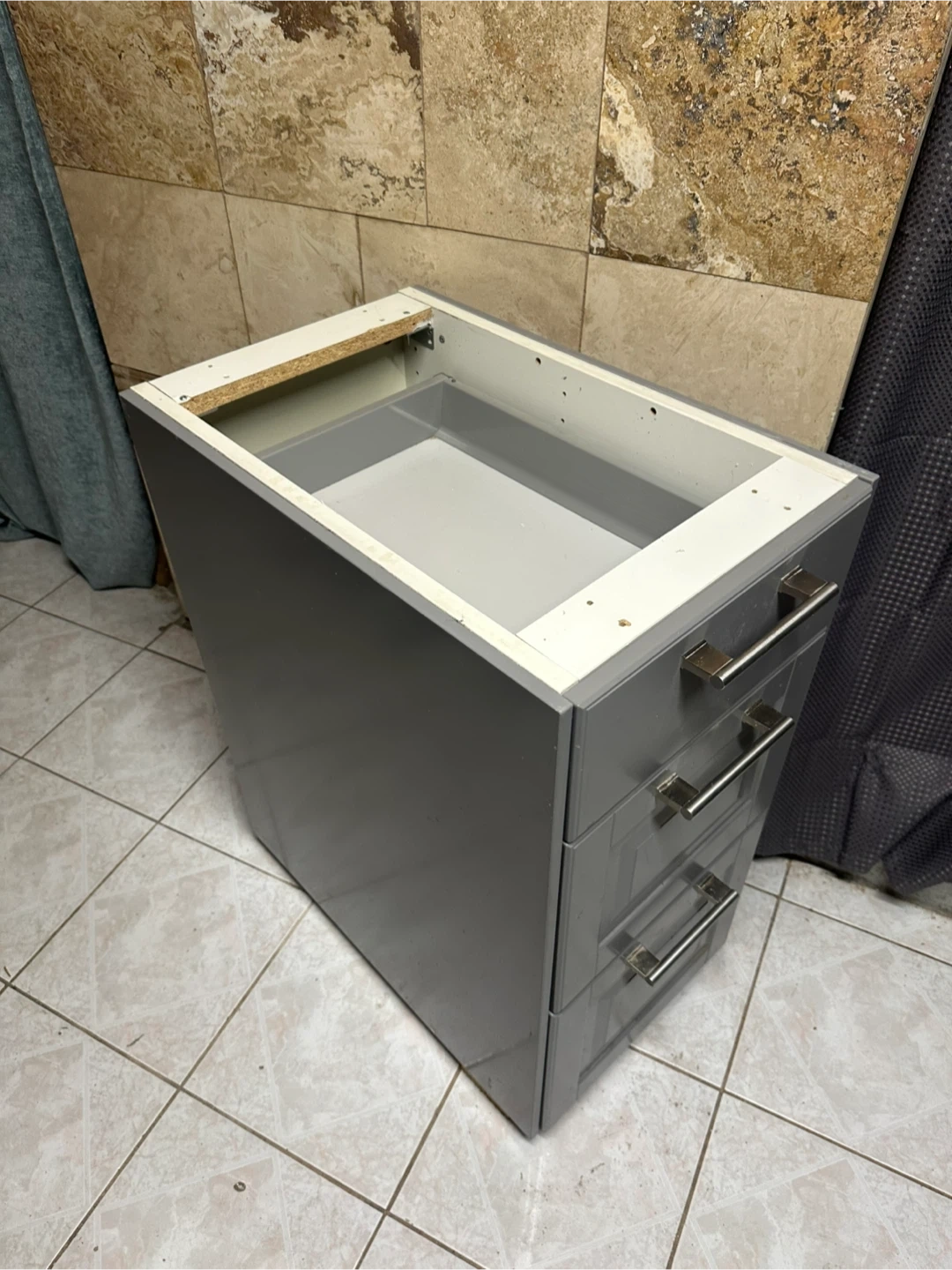 This is a grey cabinet base with three drawers.