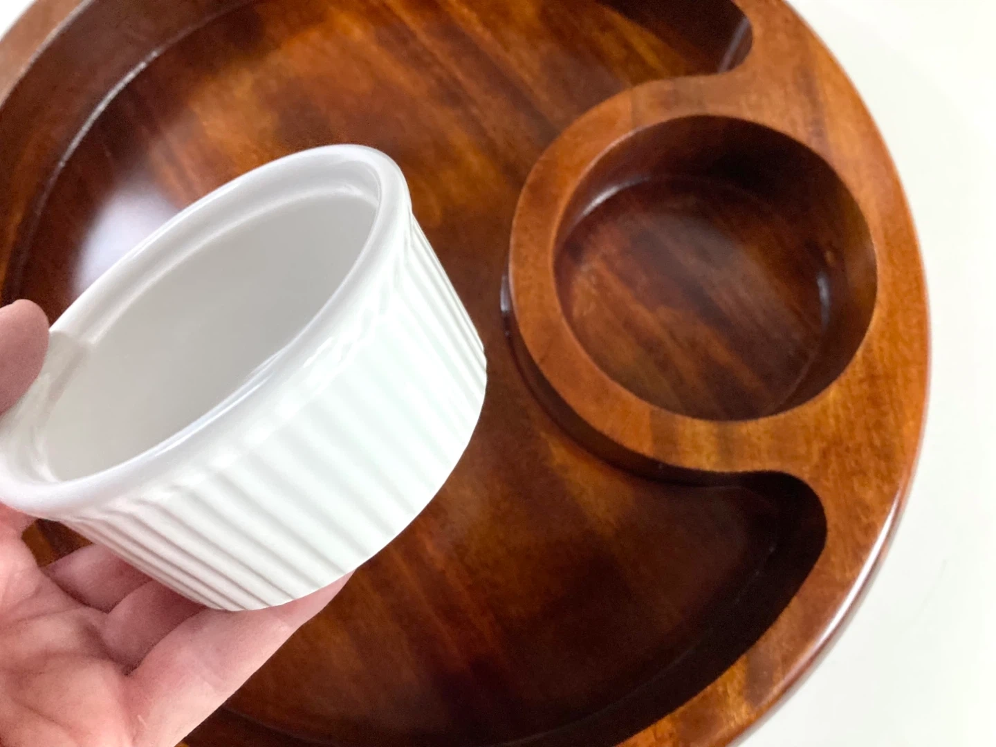 - white ceramic bowl nests in a cherry finish natural hardwood tray