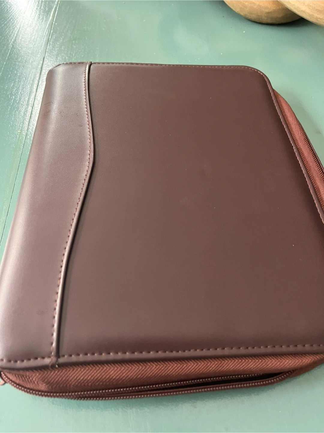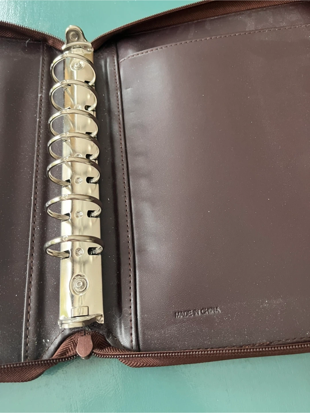 Brown faux leather zippered organizer planner binder with multiple card slots and a 7-ring binder. Made in China.