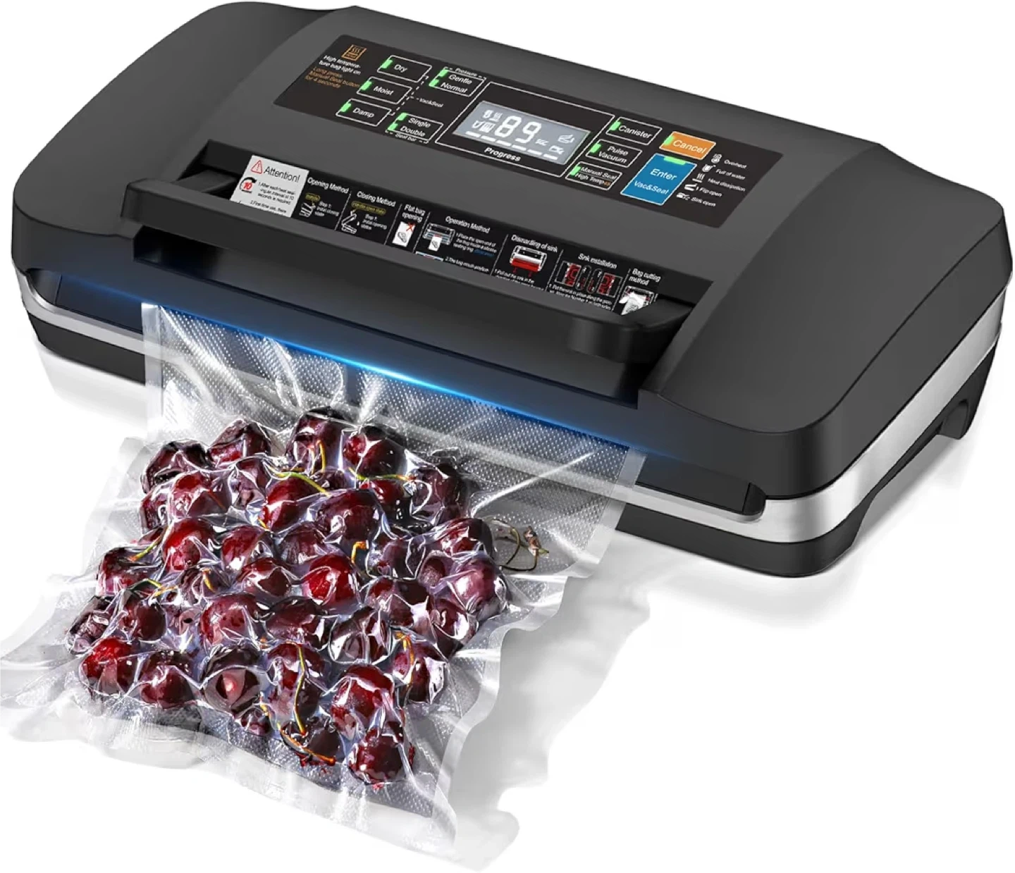 Keep your food fresh longer with this QLQIOB vacuum sealer machine! It features a countdown display, built-in cutter, and built-in bag storage.