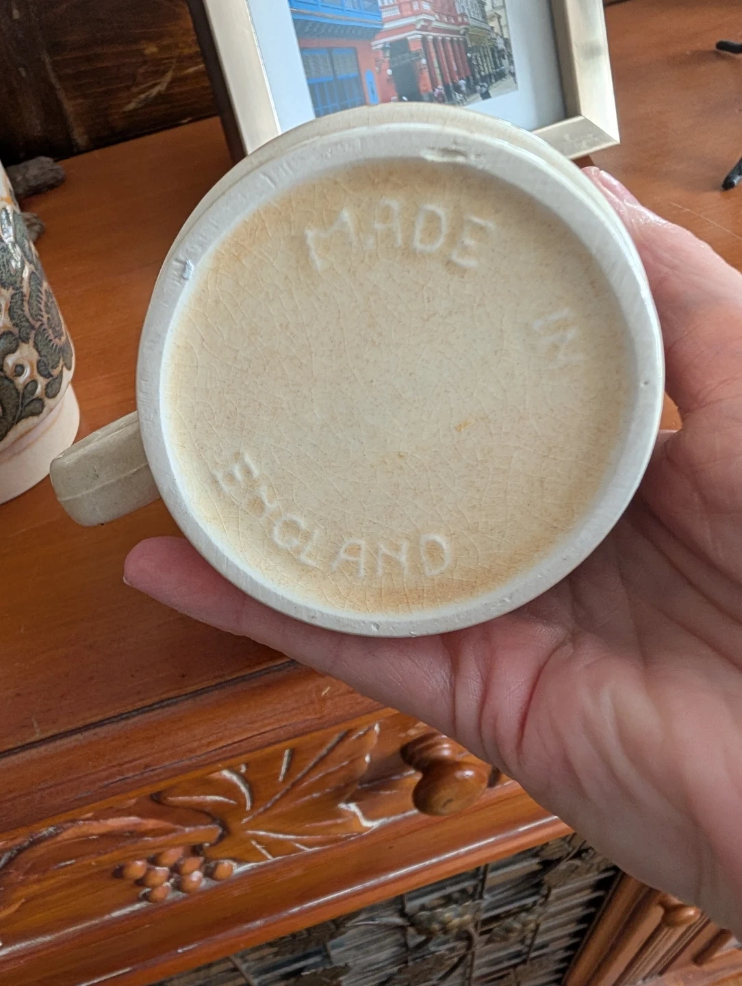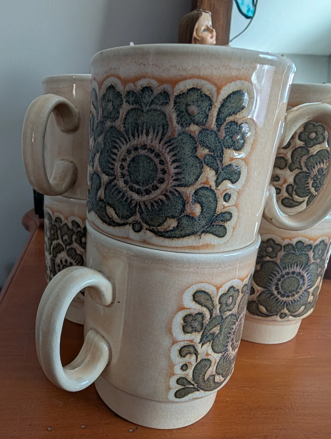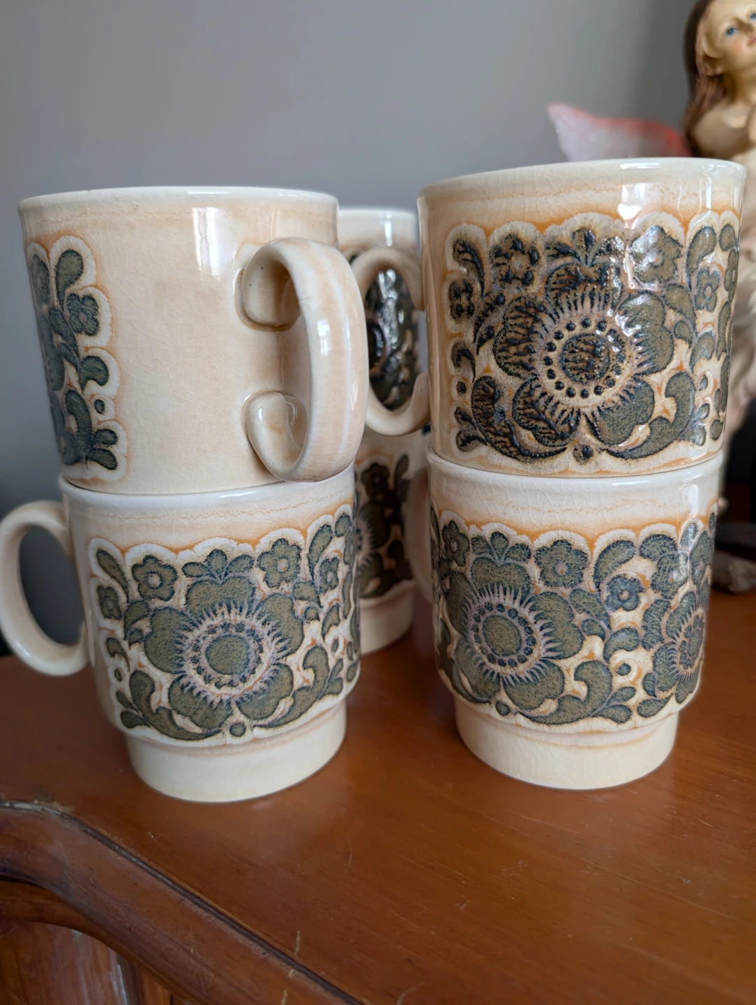Selling a set of 6 vintage Mid Winter Pottery mugs, marked "Made in England" on the bottom. They feature a unique floral design in earthy tones. Perfect for adding a touch of retro charm to your kitchen!
