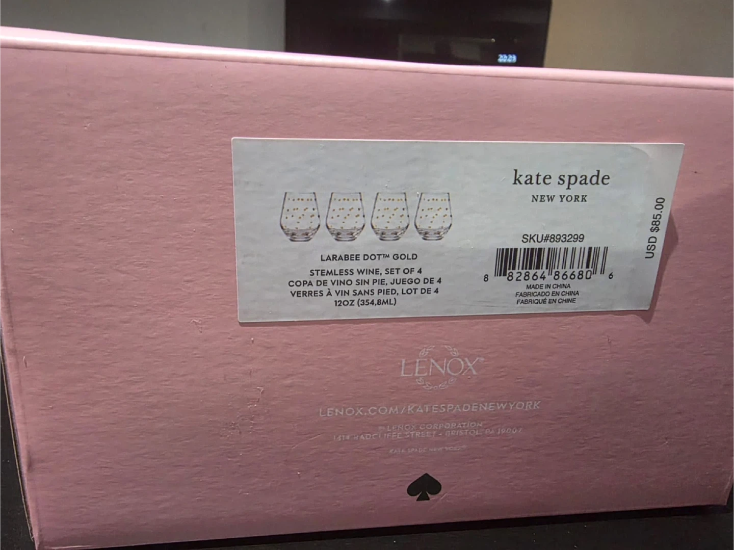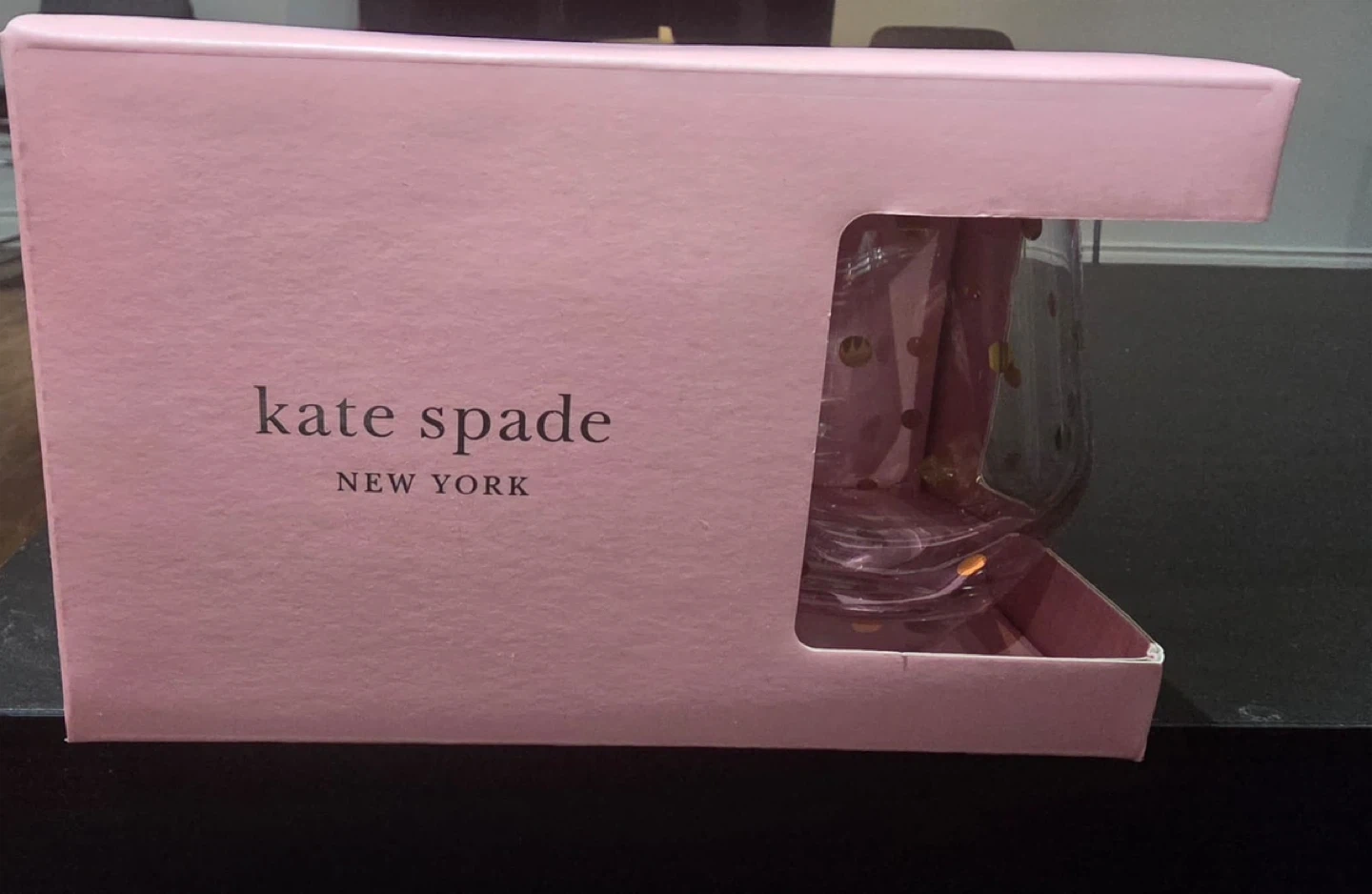Kate Spade New York Larabee Dot Gold stemless wine glasses. Set of 4, 12oz (354.8mL) each. Glass material. These are great for parties or everyday use!
