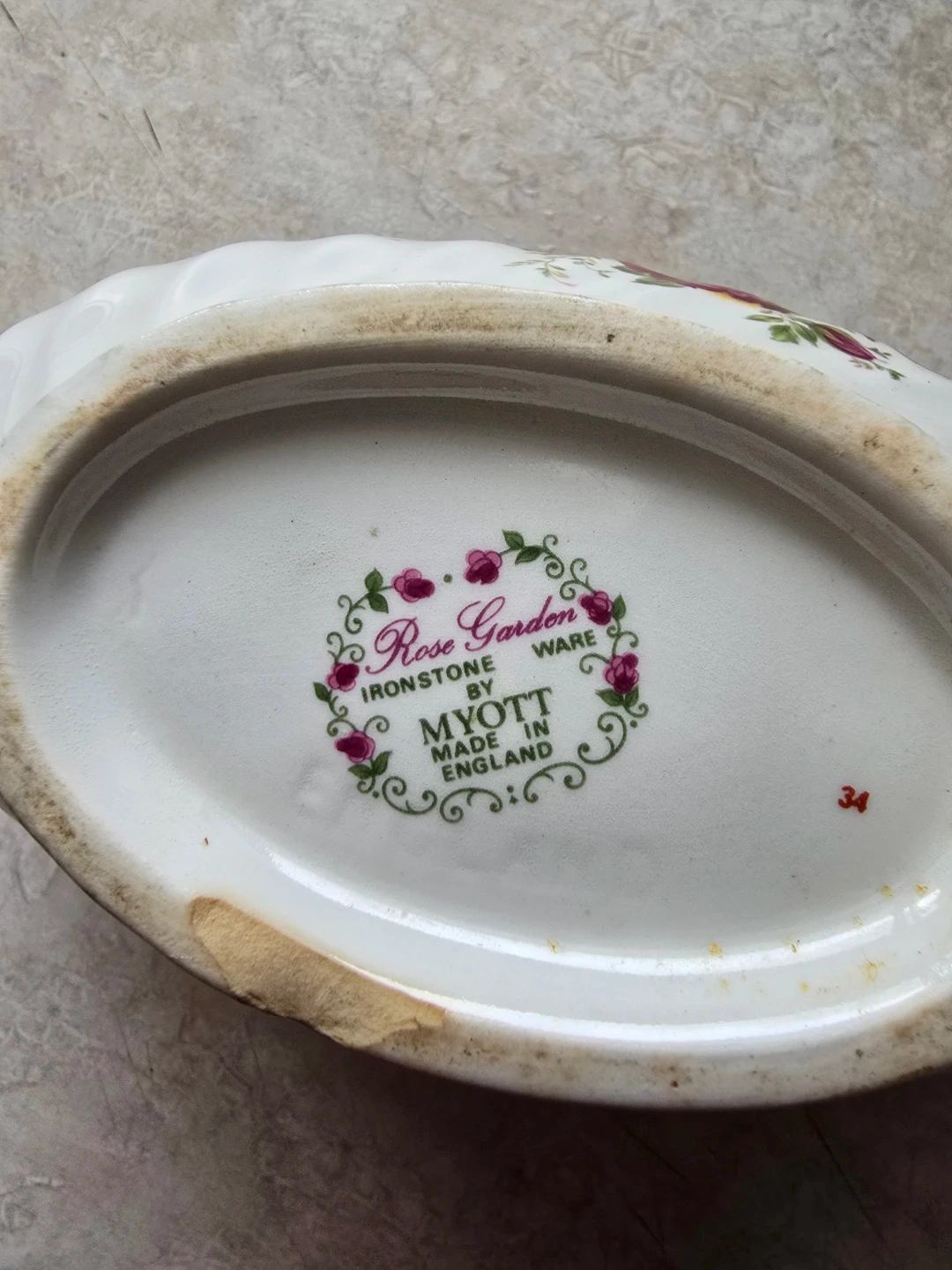 This vintage Myott gravy boat and underplate set features the "Rose Garden" pattern. It's made of ironstone and crafted in England. Great for serving gravies or sauces!