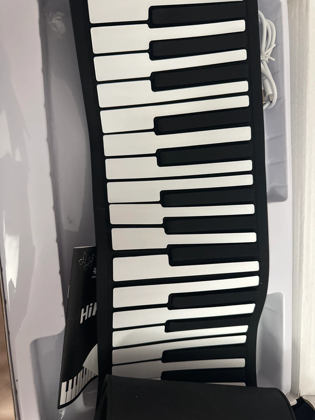 This is a HiFing 61-key roll-up electronic piano with a built-in speaker. It's powered by USB and comes with a sustain pedal. It's a flexible and portable keyboard for learning and practicing music.