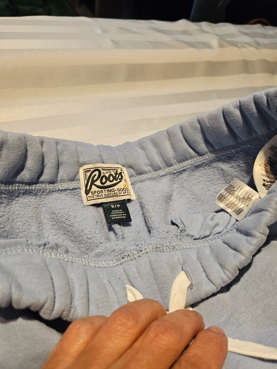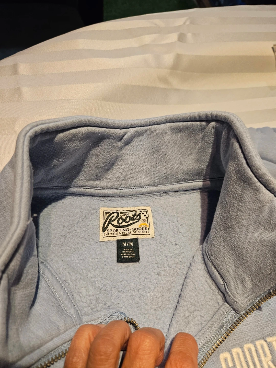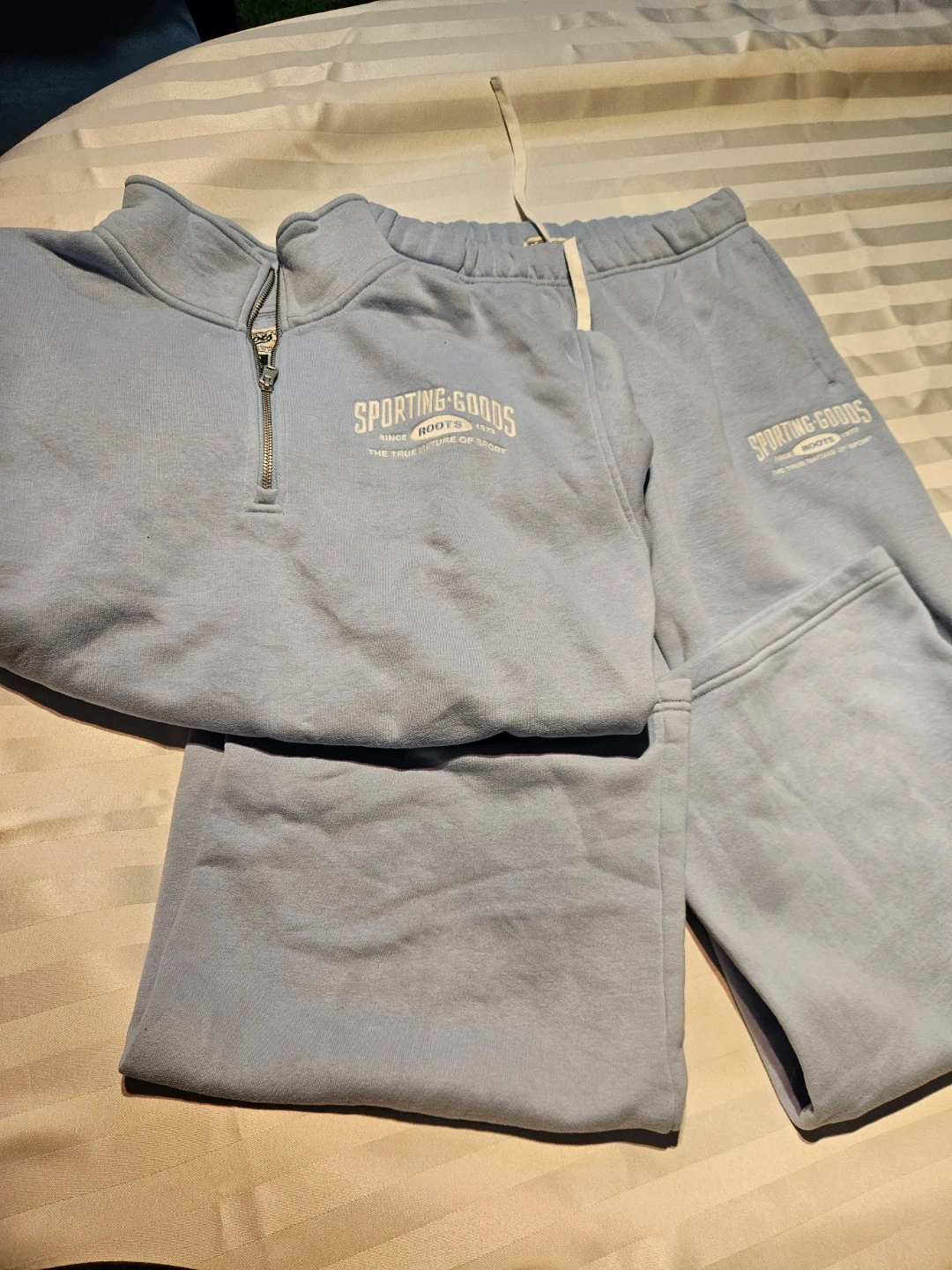 Light blue Roots 'Sporting Goods' half-zip sweatshirt and sweatpants. Sweatshirt is size M/M, sweatpants are size S/P. Made in Cambodia.