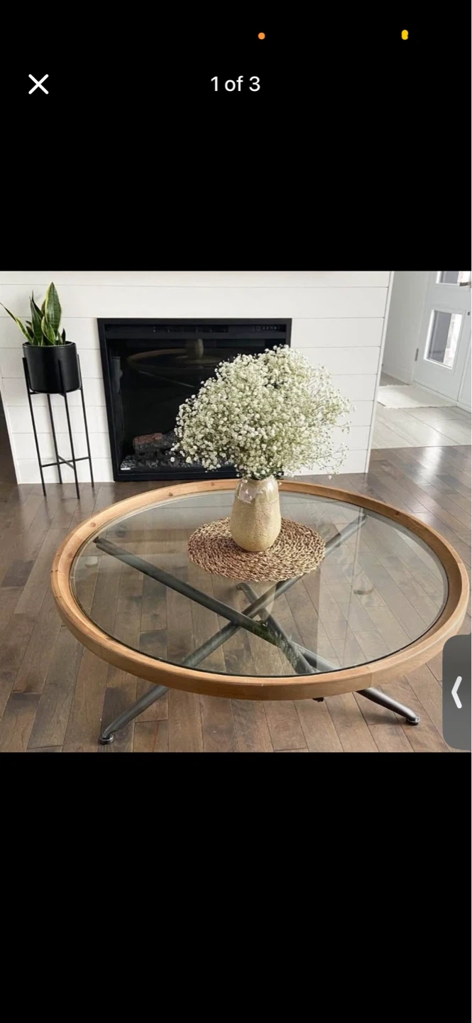 Round coffee table with a wood rim and metal legs. Features a clear glass top with a textured mat underneath. It's a stylish addition to any living space.