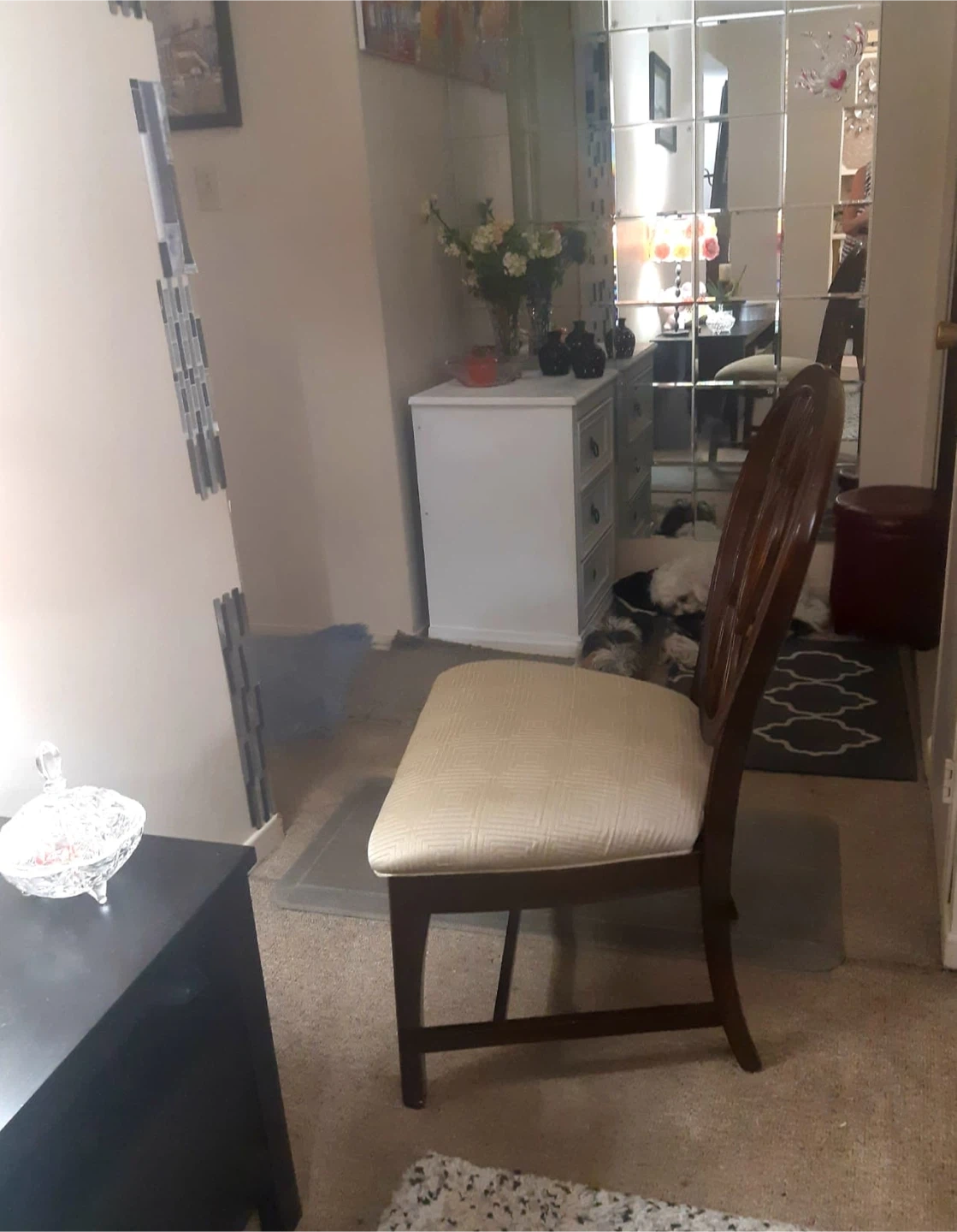 Wooden Dining Chair with Beige Cushion.