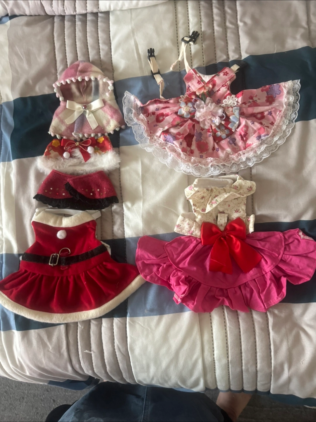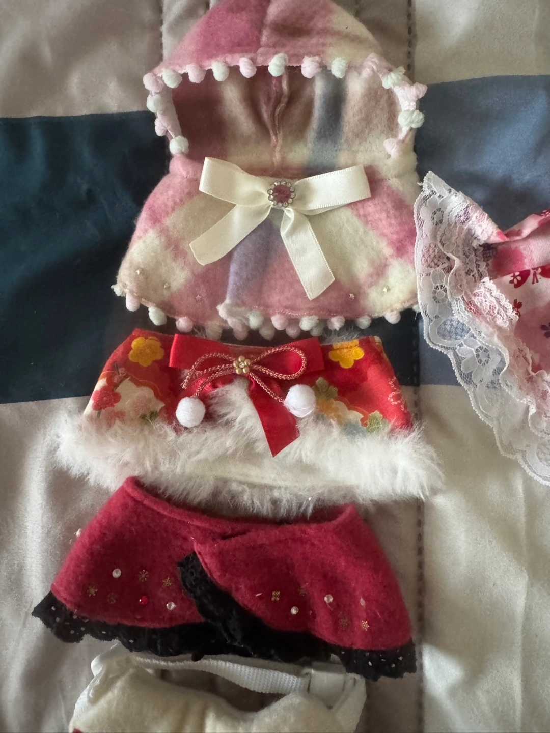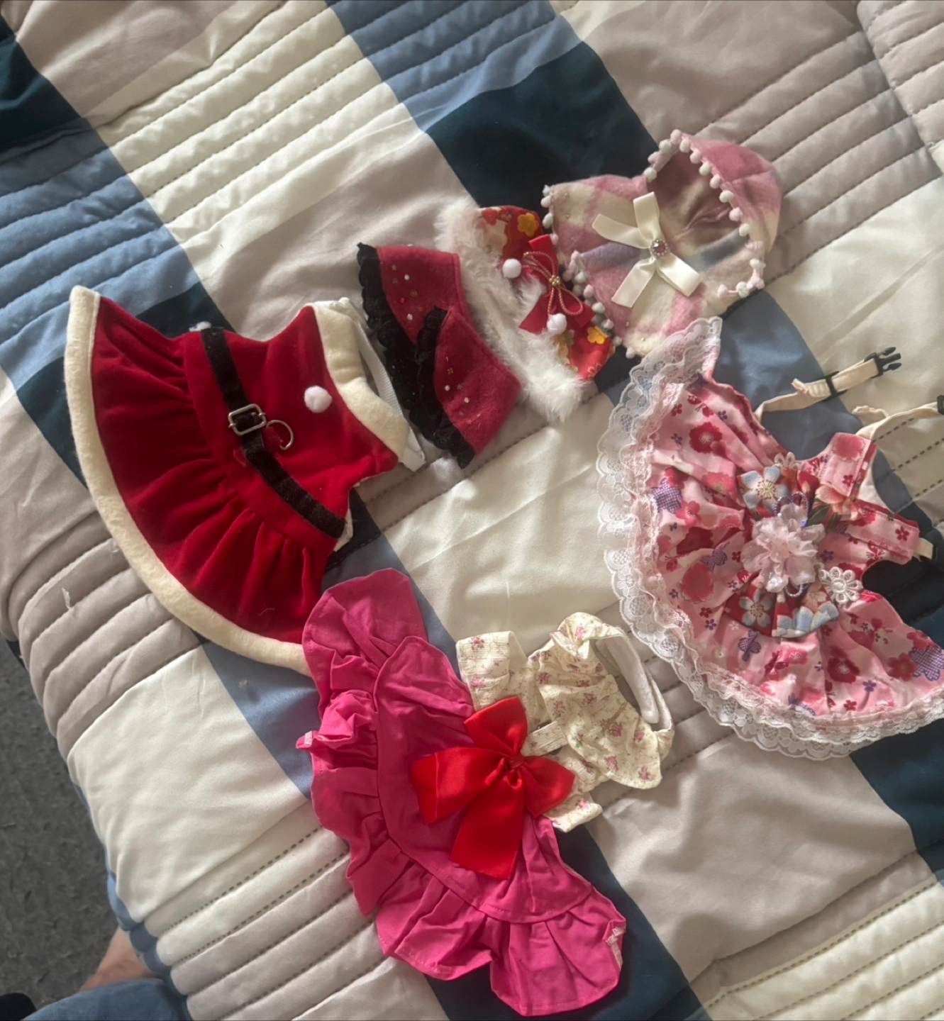 うさぎSサイズ ハーネス、ケープ 6点セット うさぎSサイズです ネザーの子なら問題なく着用出来ます 晴れ着タイプ、サンタタイプ、ドレスタイプなど 1~2回着用しました 後はグチャっと丸めて保管しておりました サンタハーネスの腰紐が半分くらい取れかかっています そのままでも大丈夫とは思いますが、補修していただけるとより安心かと思います 保管シワ、ホコリ等あります 新品をご希望の方は、ショップにてお買い求めください ハーネスは1着3~4000円でした ケープは未着用の物もあります ファミリーマート登戸郵便局西店まで来てくださる方、よろしくお願いいたします